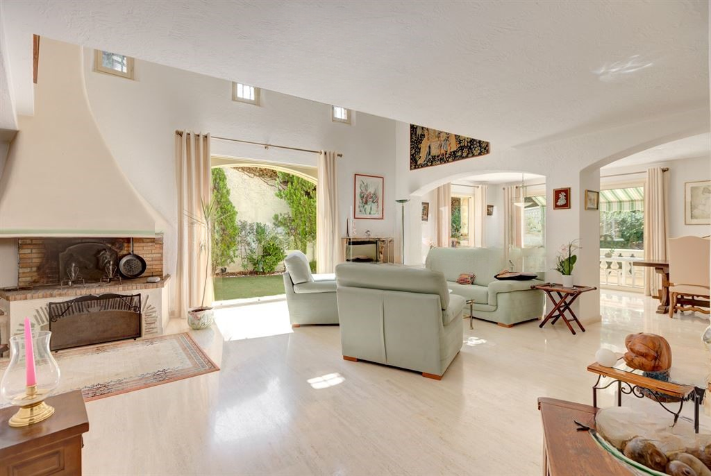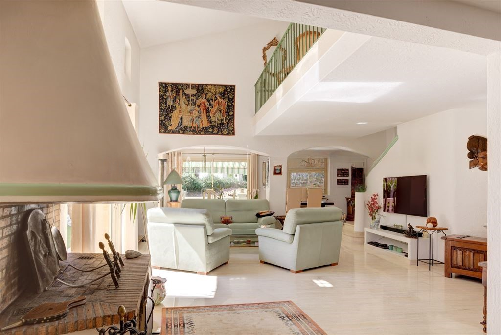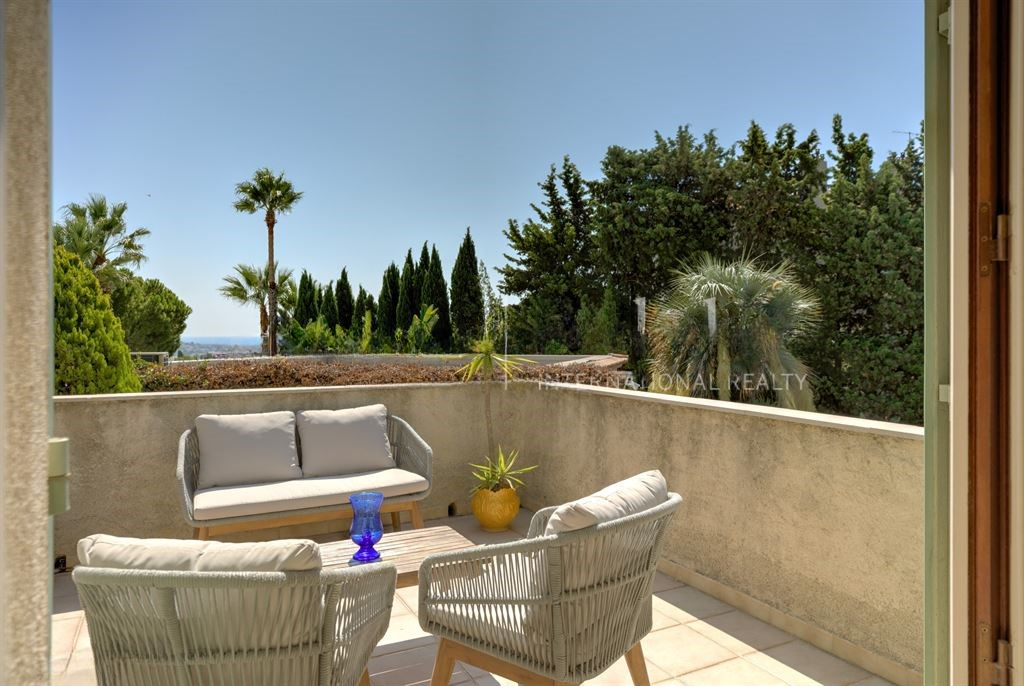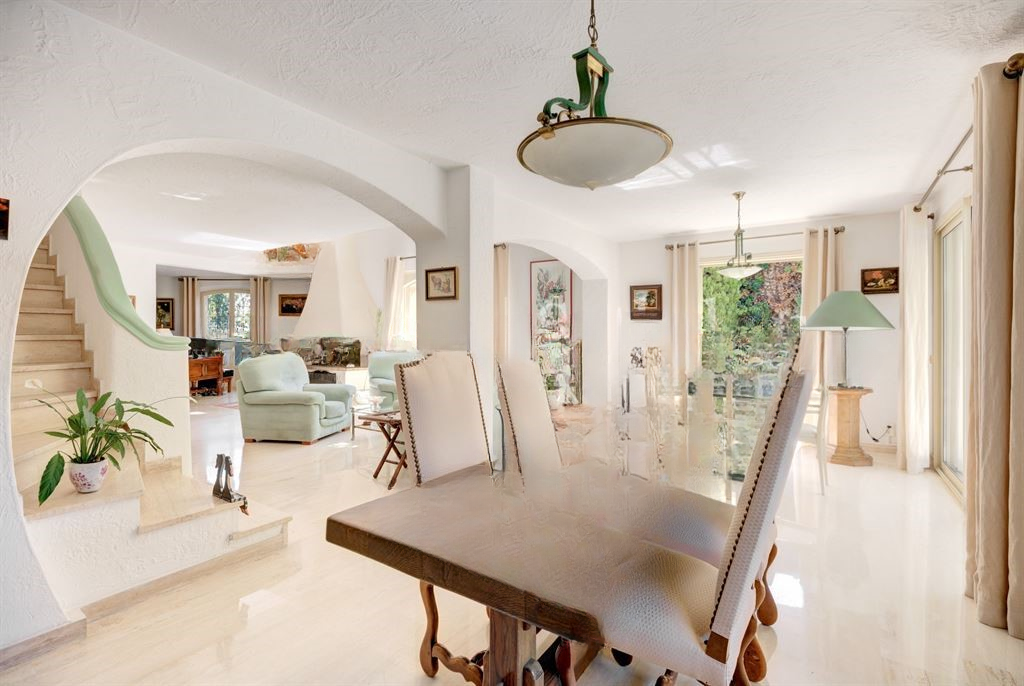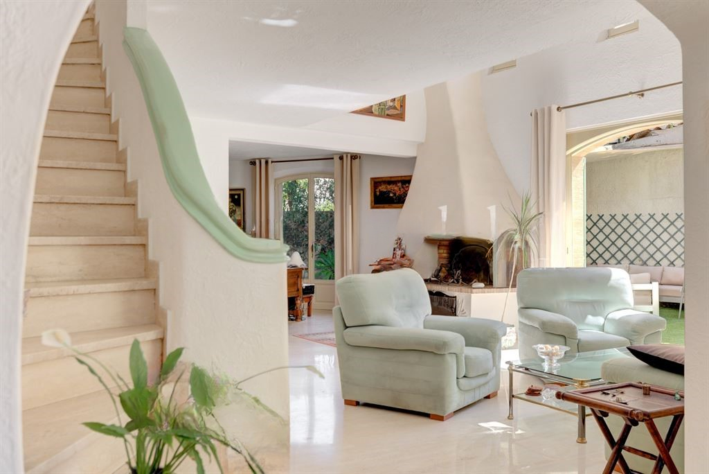 На первом этаже вы обнаружите также отдельную кухню, спальню с душевой, а также гостевой туалет. На втором уровне мезонин распределяет две спальни с ванными комнатами и туалетами. Одна из спален имеет террасу с видом на море.