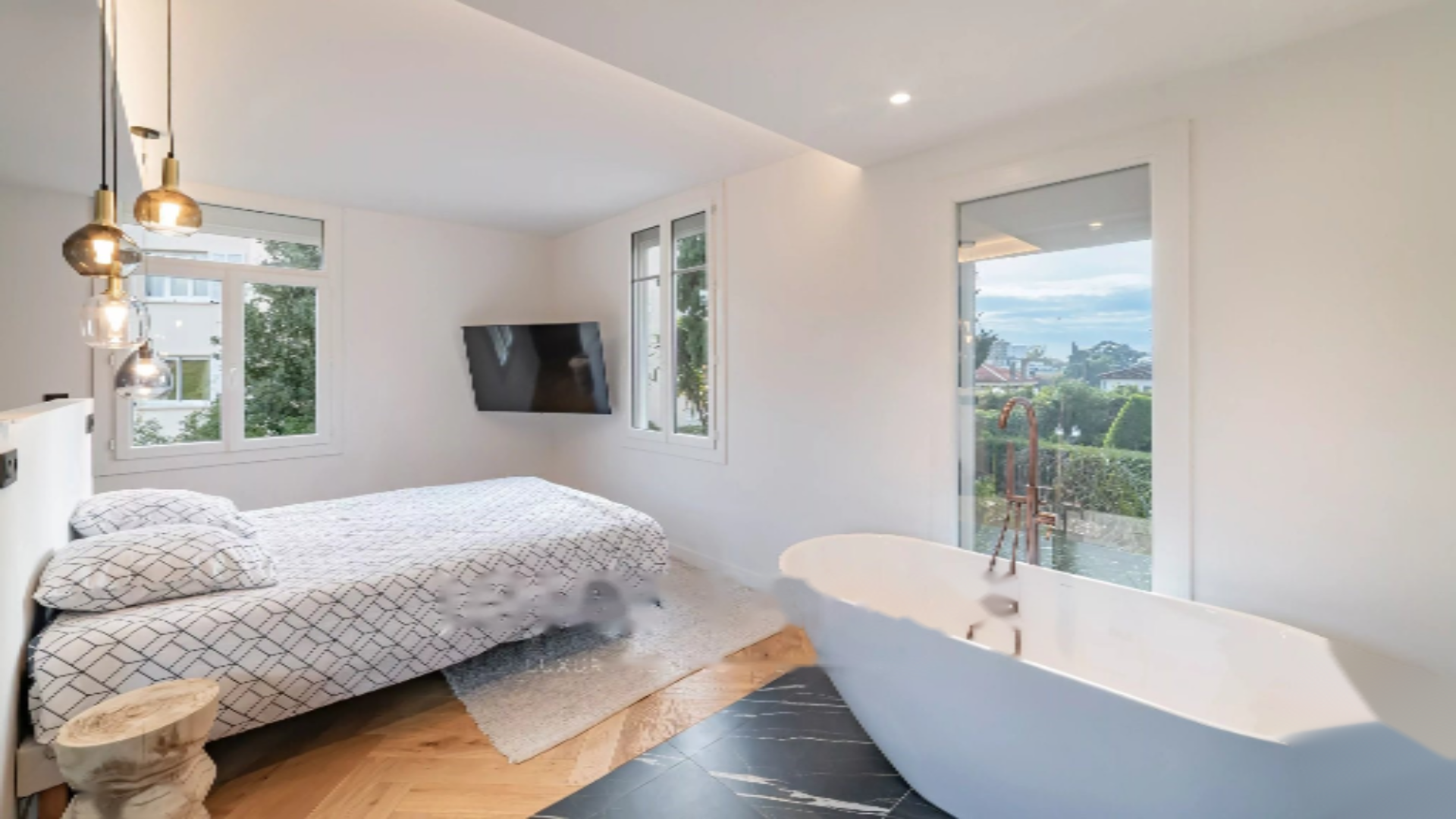 На верхнем этаже: спальня в люксе с гардеробной и две спальни, разделяющие ванную комнату и отдельный туалет.