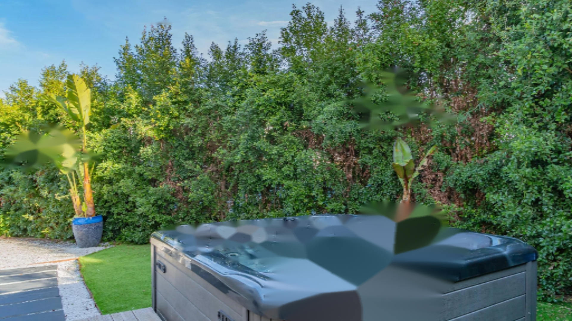 Виллу окружает ландшафтный сад площадью около 205 м², в котором находится джакузи, булодром и парковочные места.