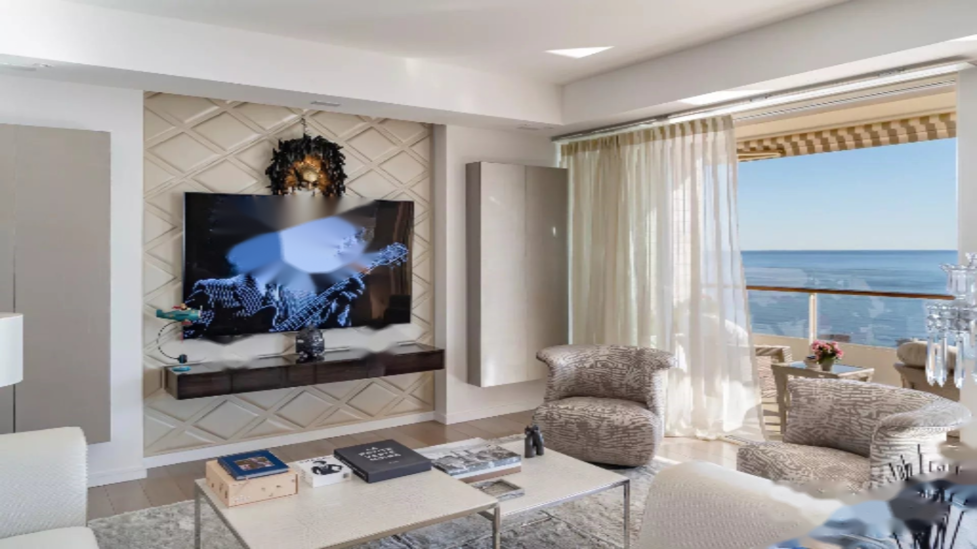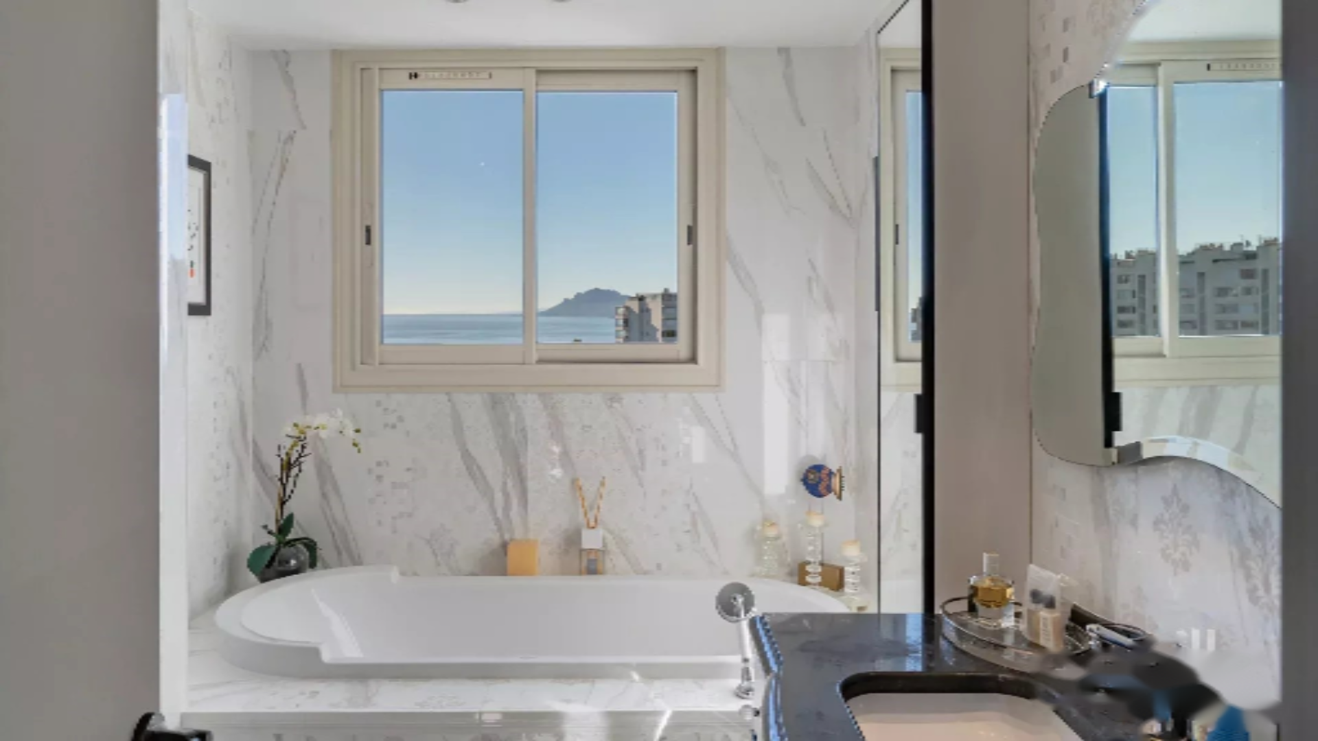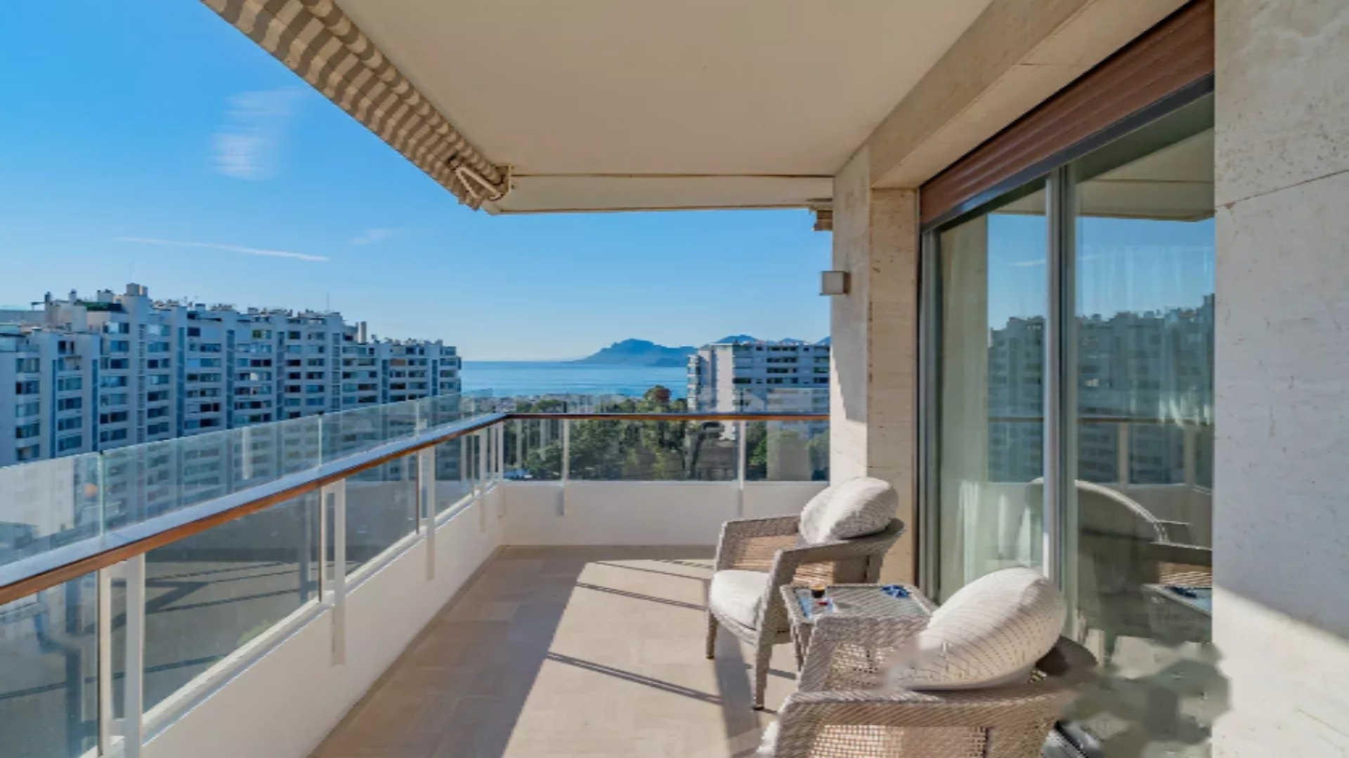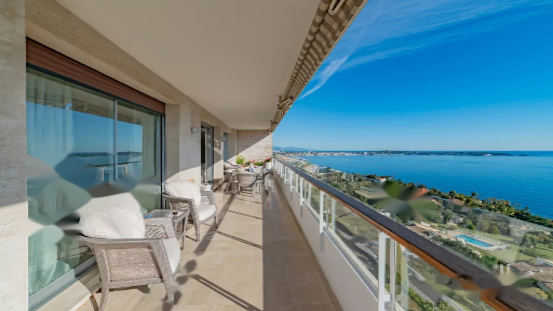 Погруженный в свет, гостиная выходит на великолепную угловую террасу примерно 50 м², предлагающую панорамный вид на 180 градусов — на море, острова Лерин, Эстерель и Кап д’Антиб.