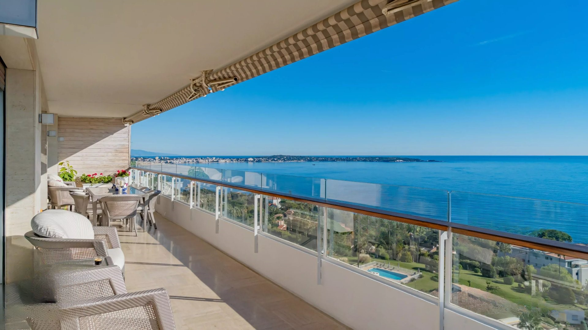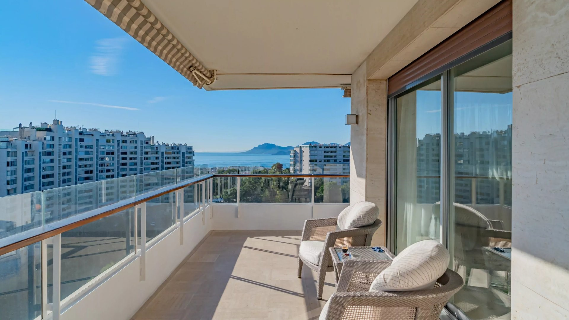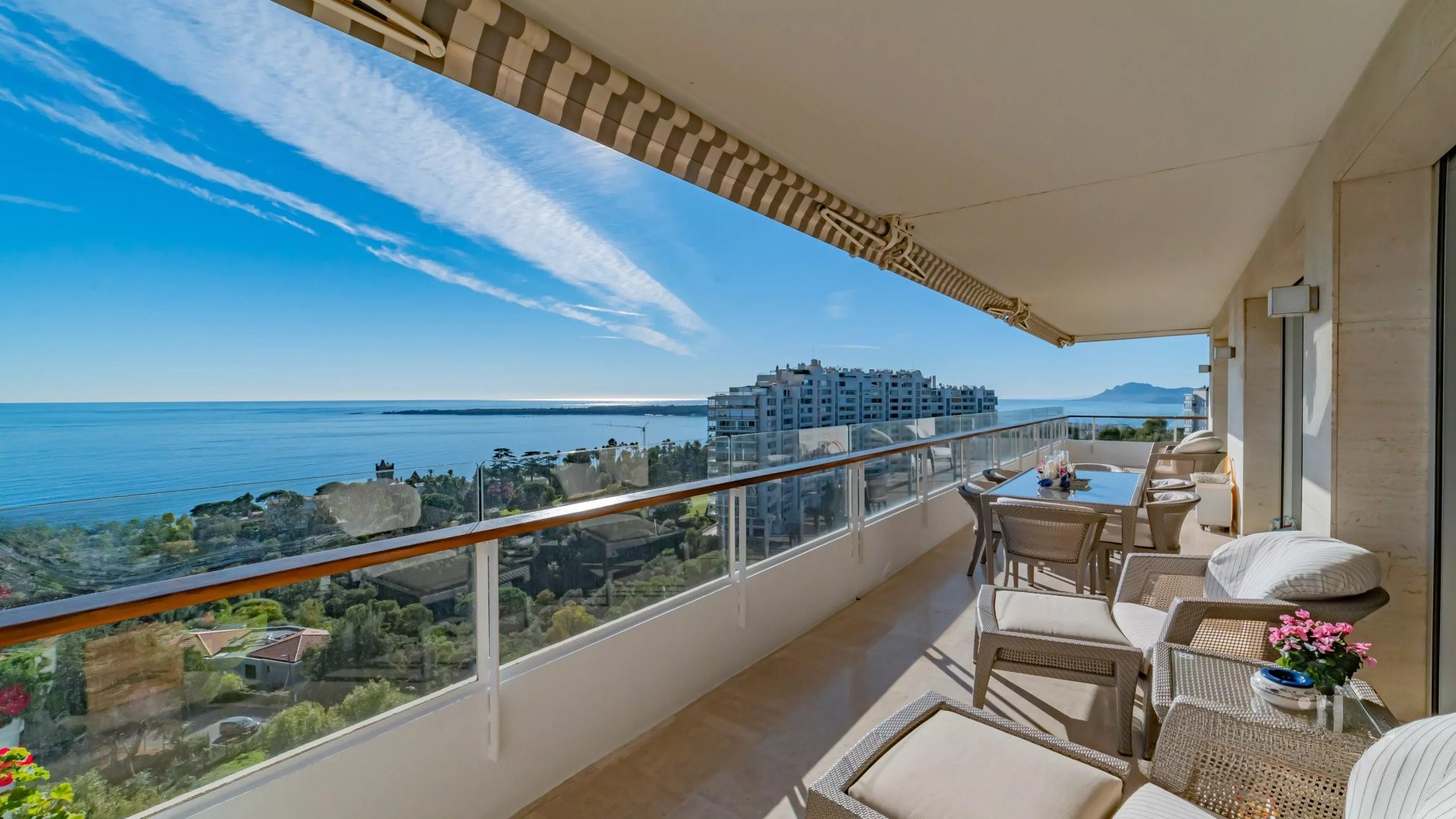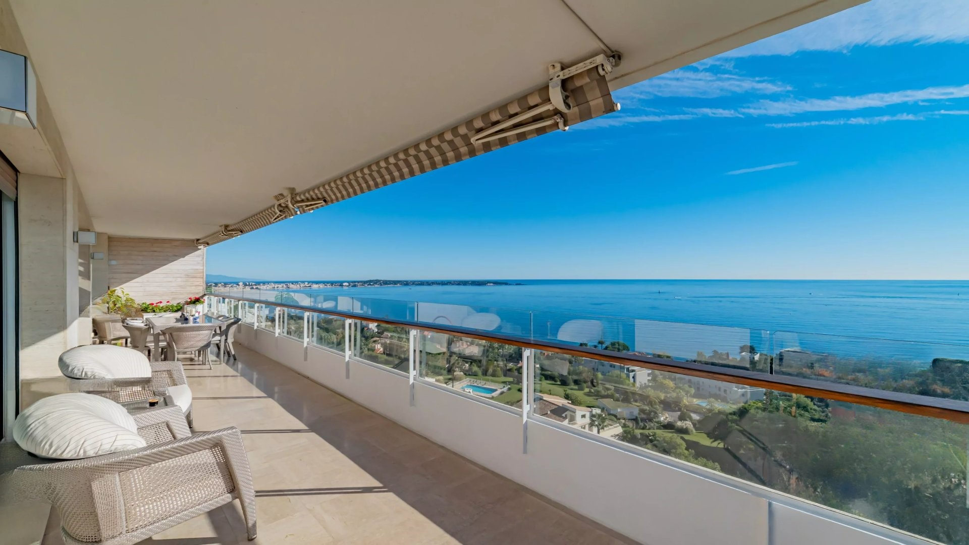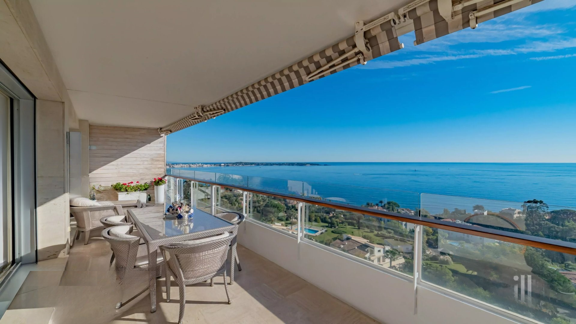 Залитая светом гостиная выходит на великолепную угловую террасу площадью около 50 м², предлагающую панорамный вид на 180 градусов, на море, острова Лерин, Эстерель и мыс Антиб.
