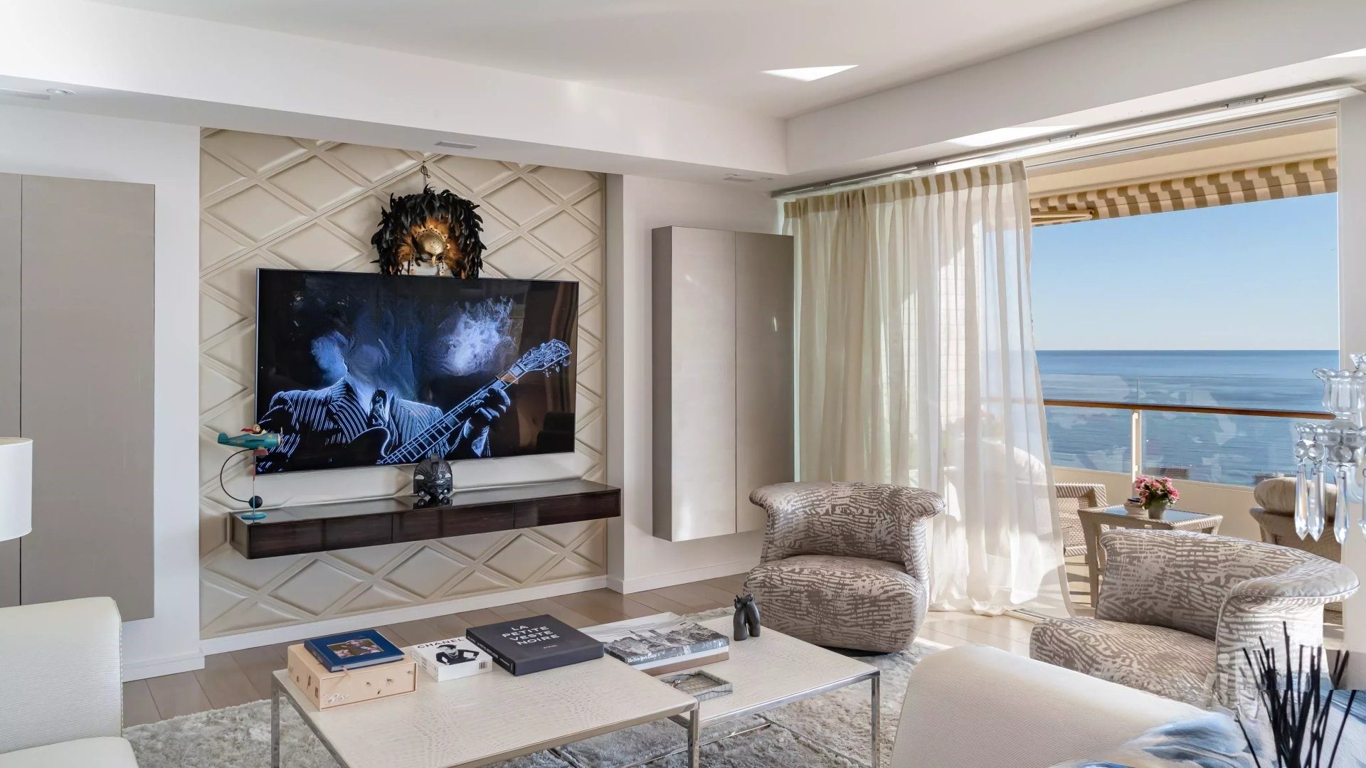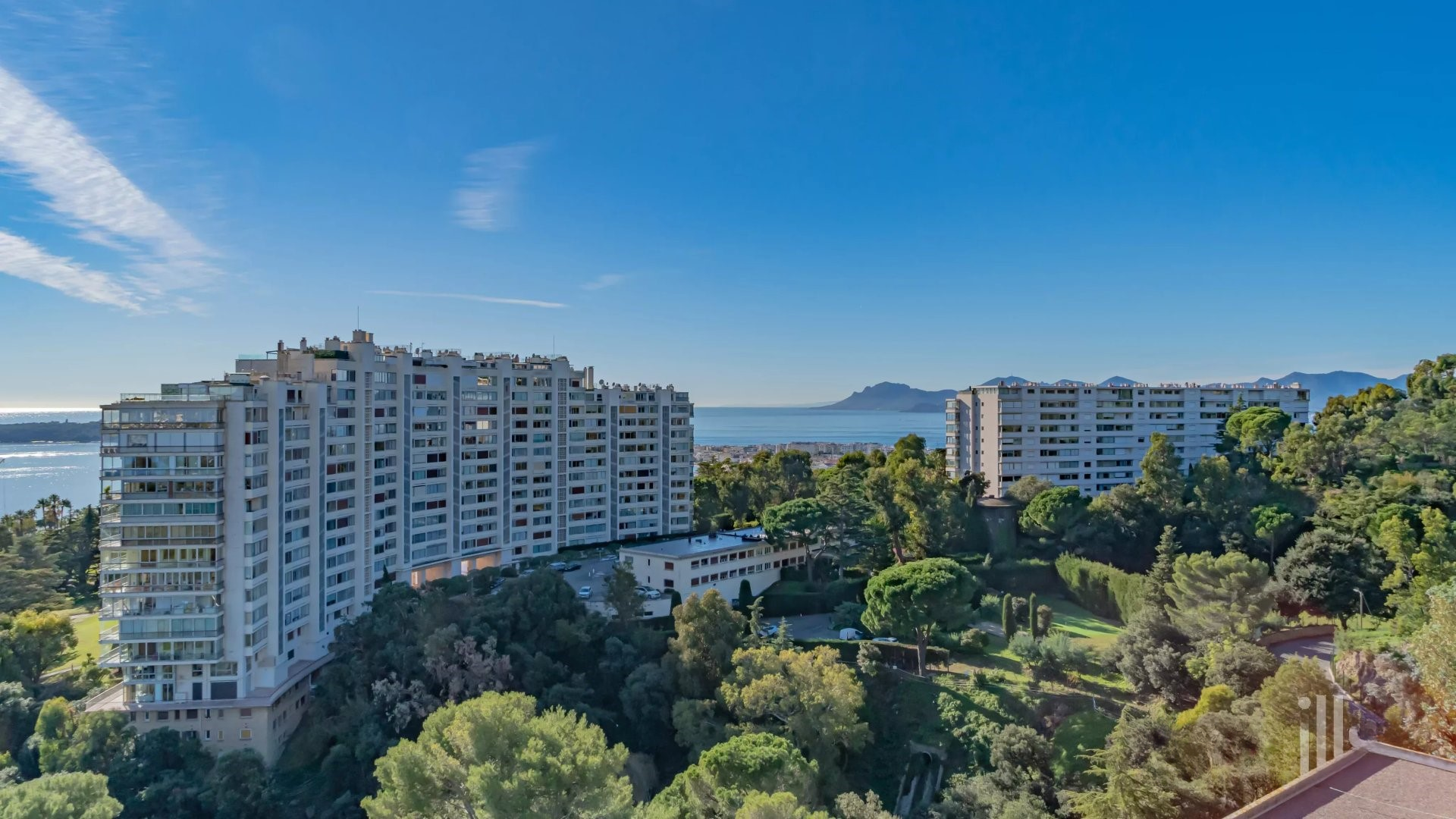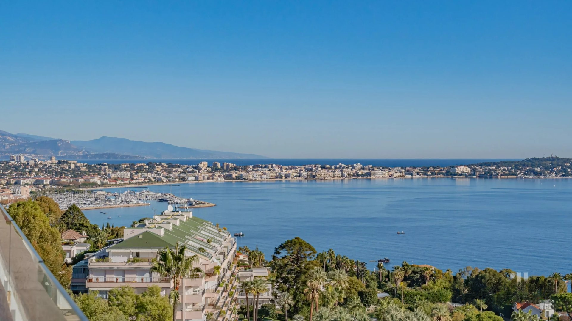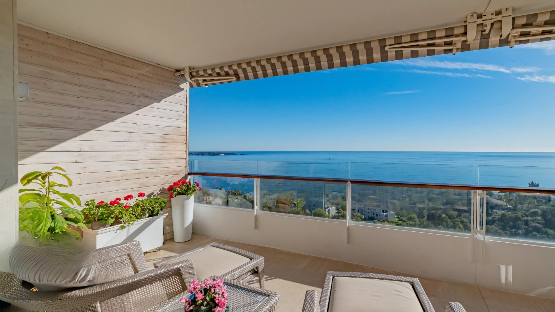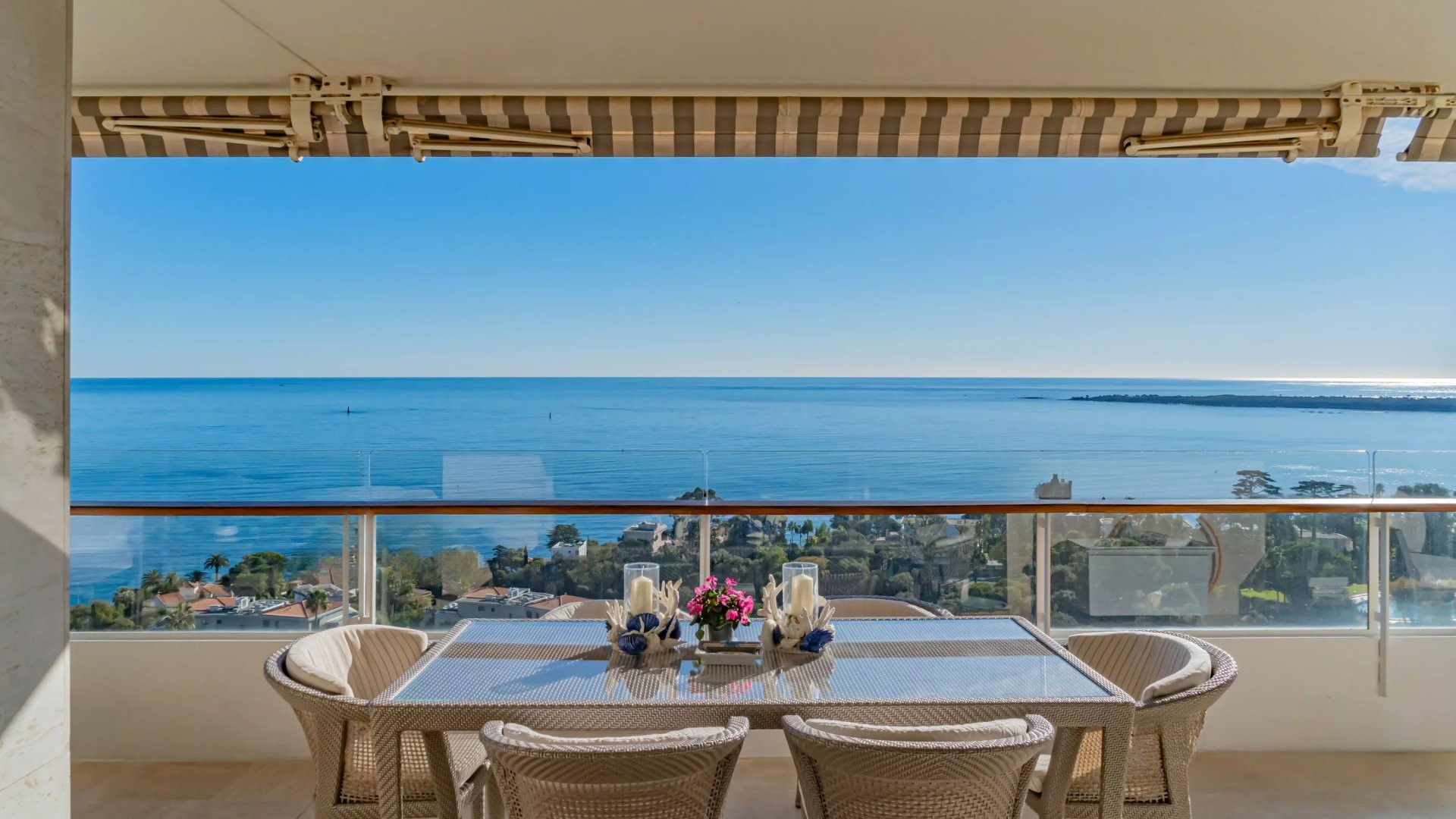 Залитая светом гостиная выходит на великолепную угловую террасу площадью около 50 м², предлагающую панорамный вид на 180 градусов, на море, острова Лерин, Эстерель и мыс Антиб.