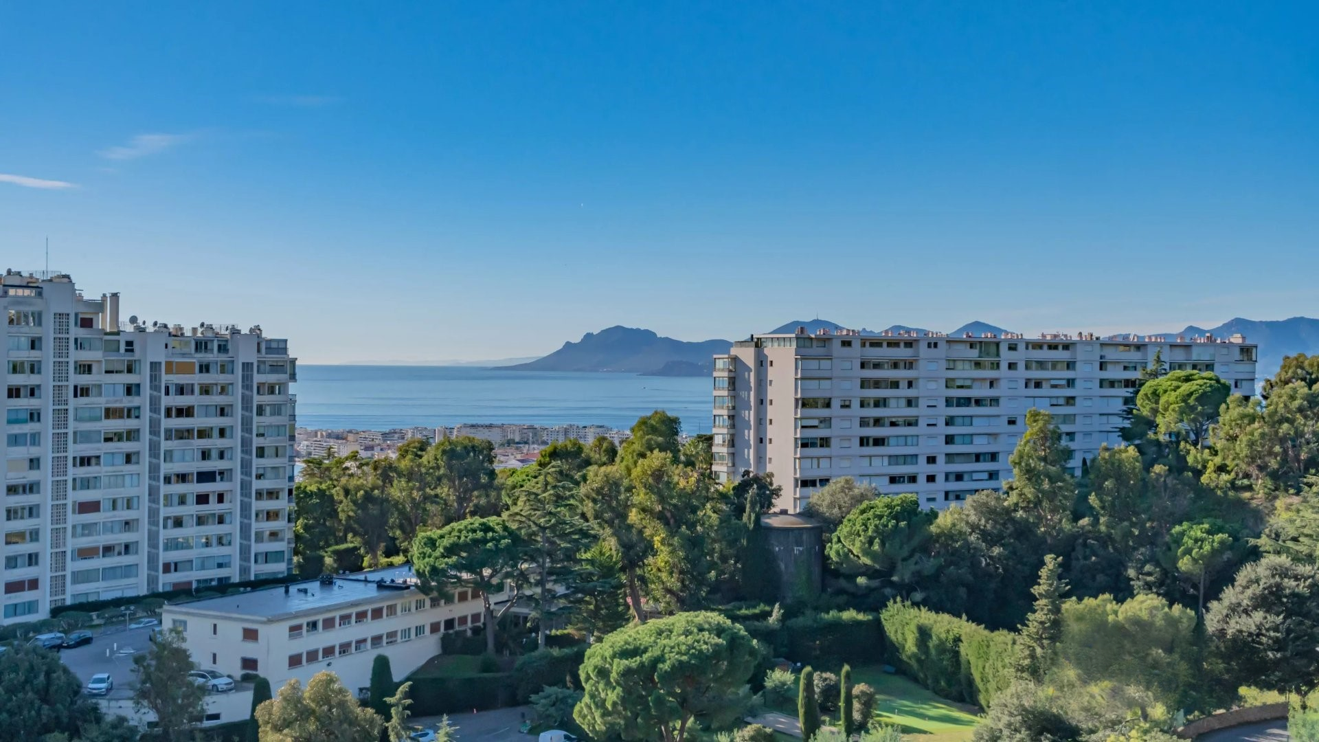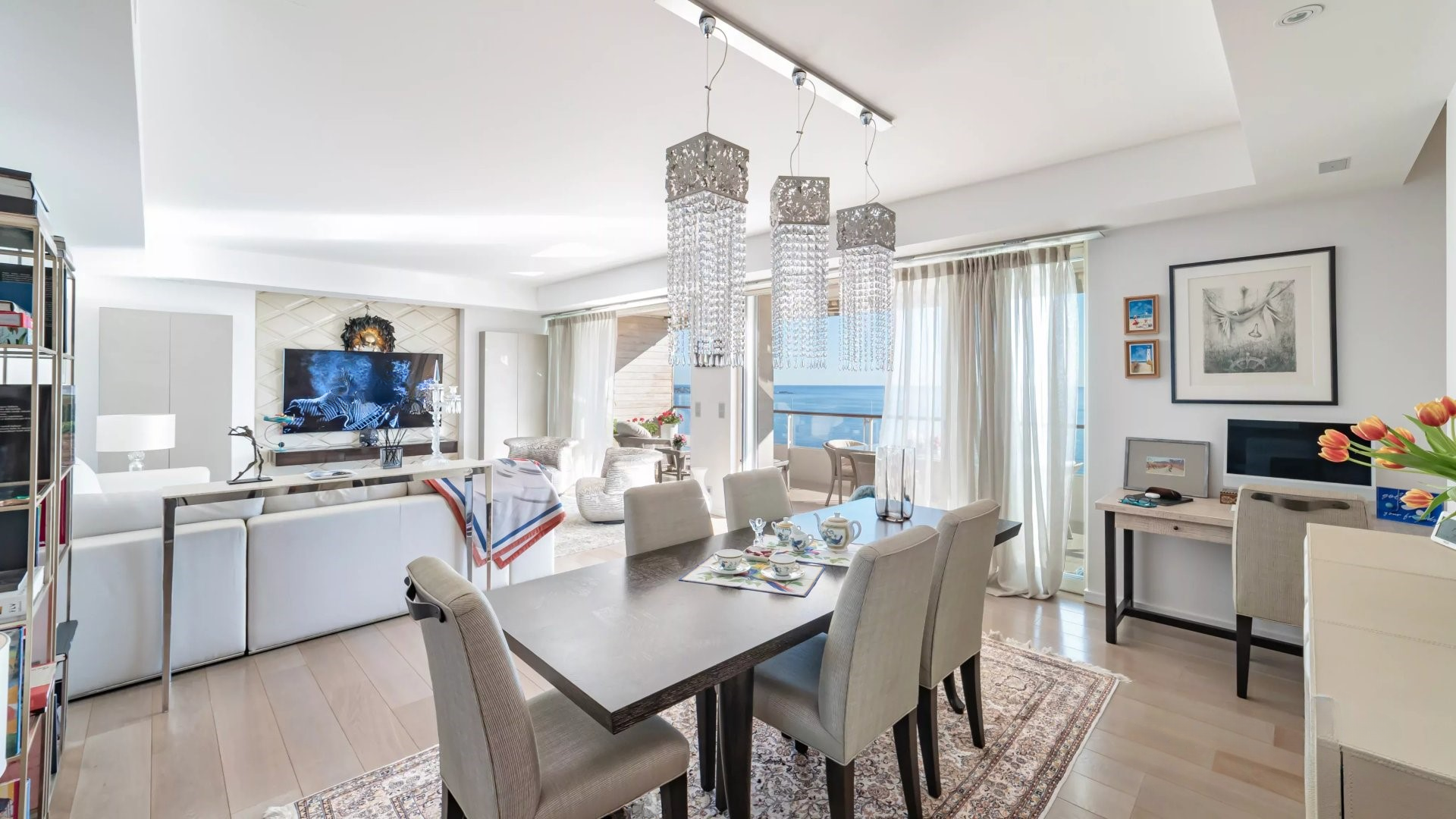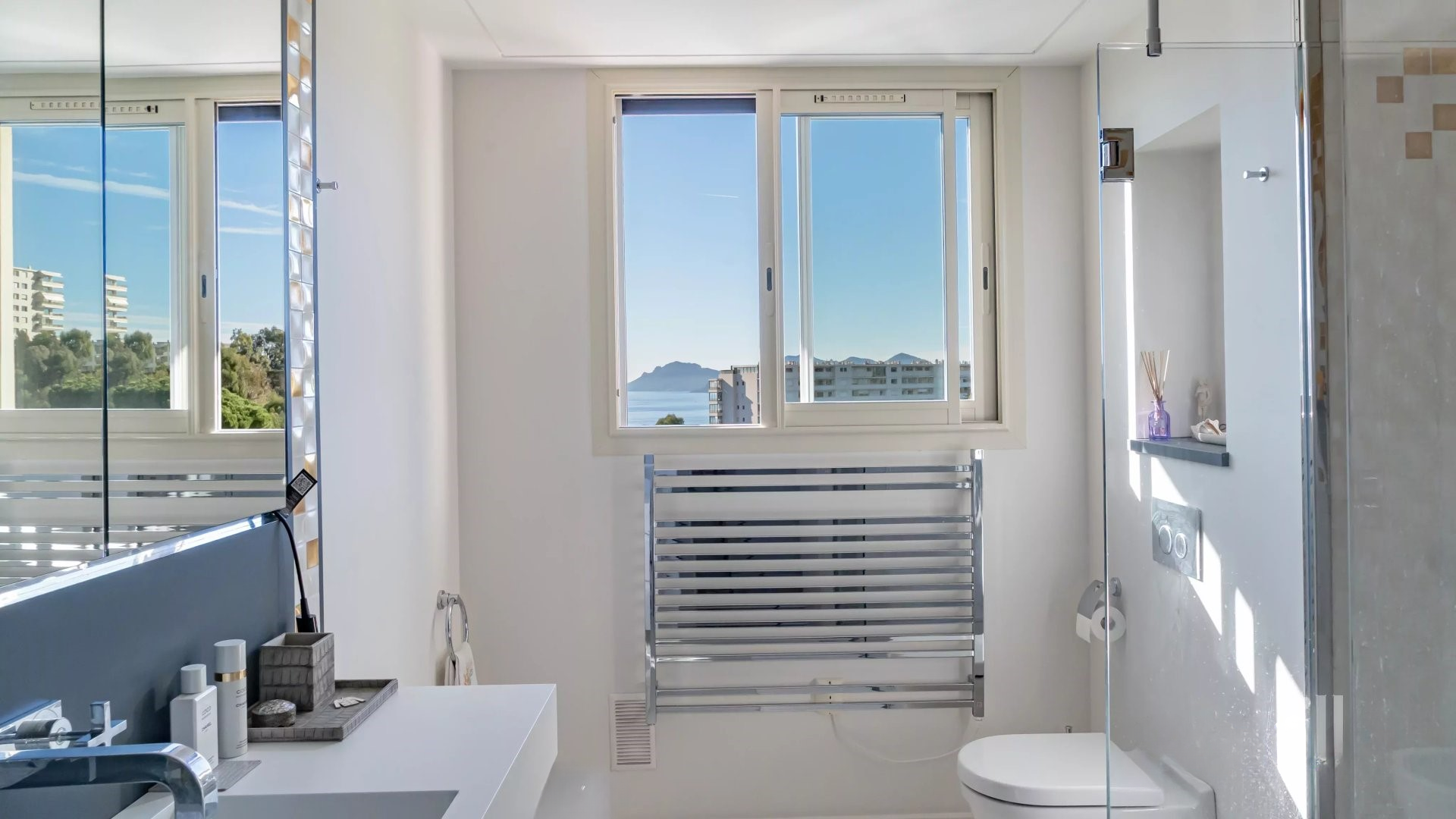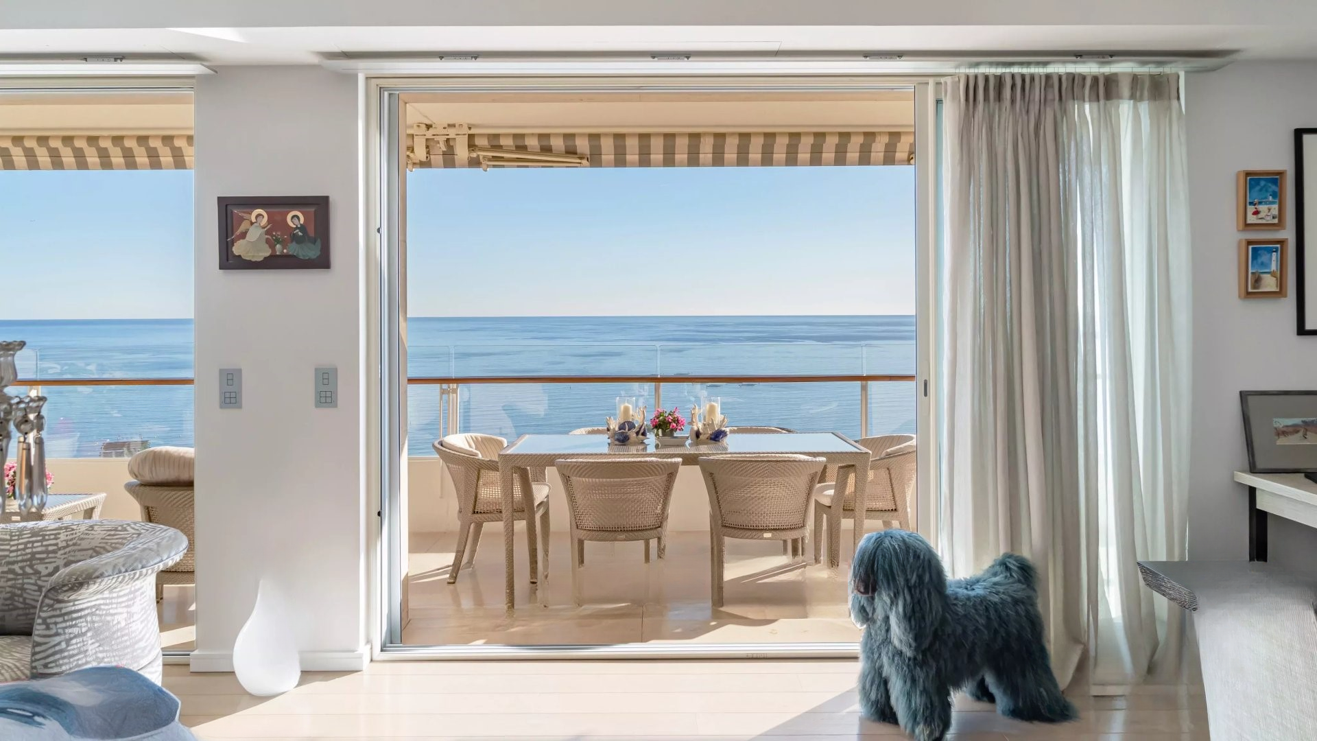 Залитая светом гостиная выходит на великолепную угловую террасу площадью около 50 м², предлагающую панорамный вид на 180 градусов, на море, острова Лерин, Эстерель и мыс Антиб.