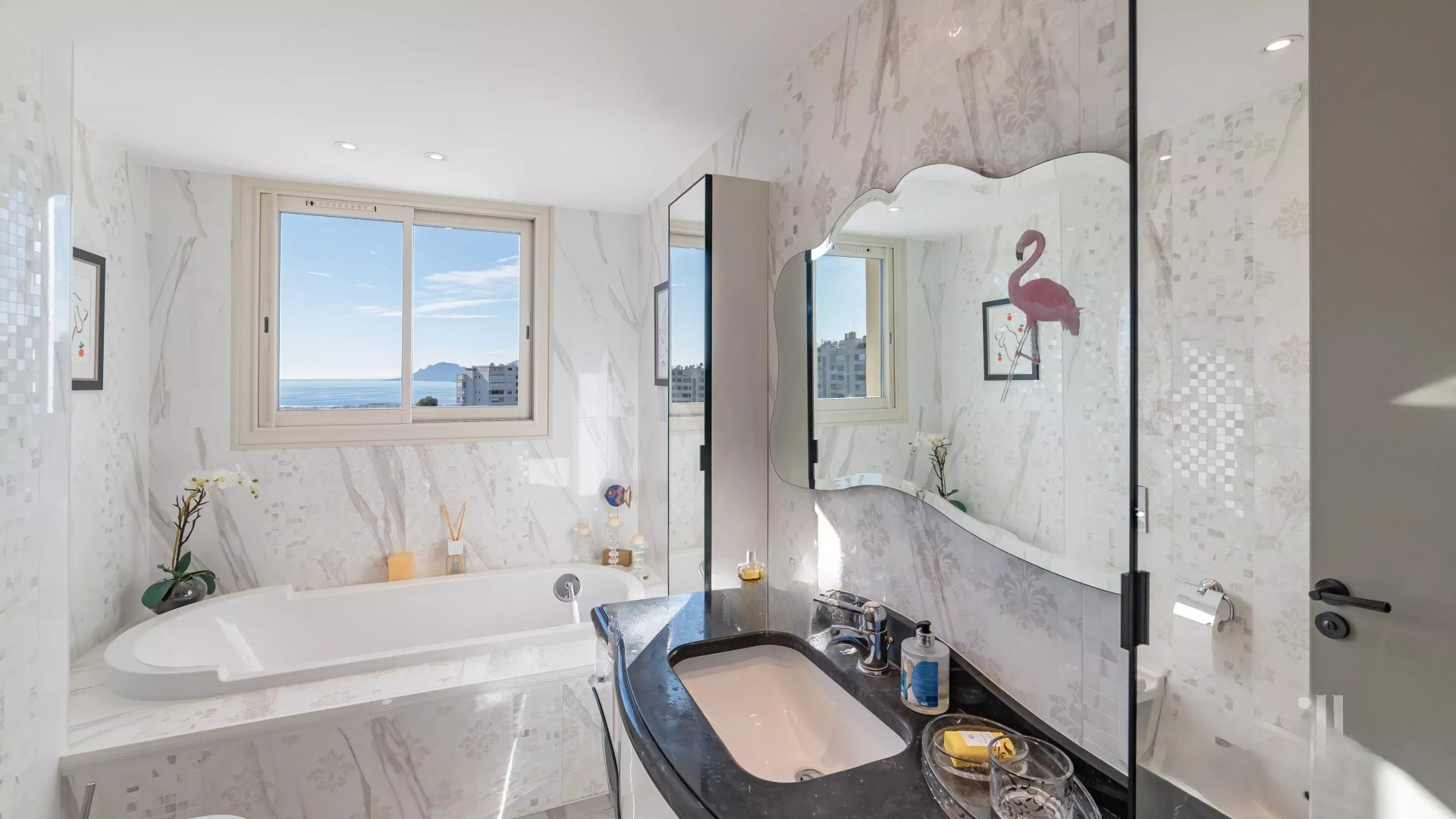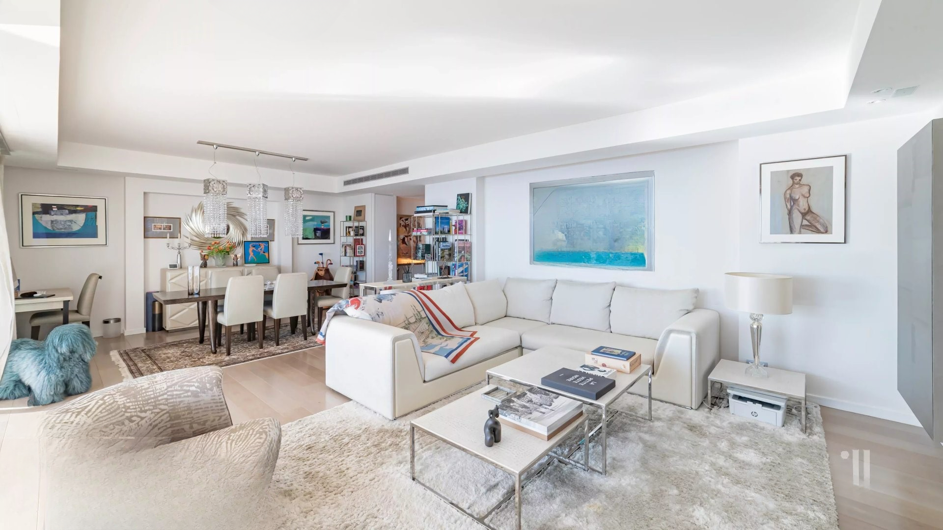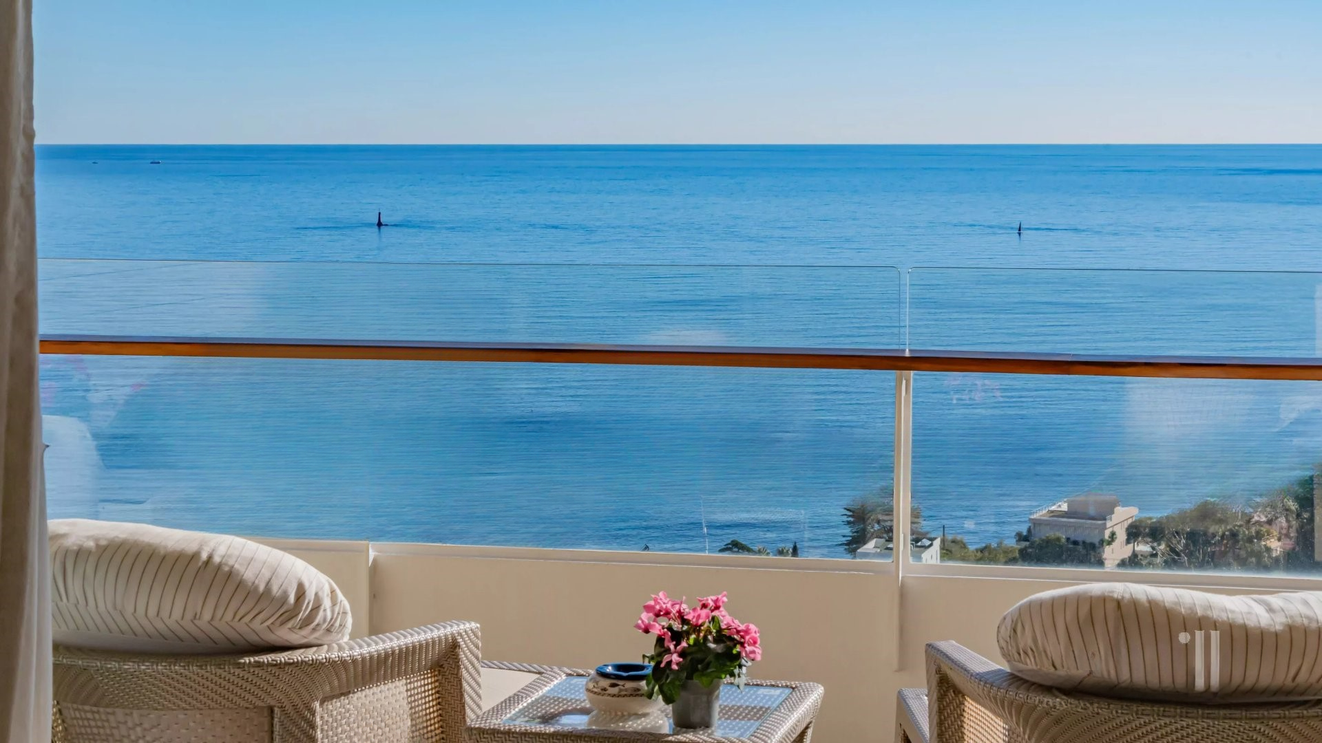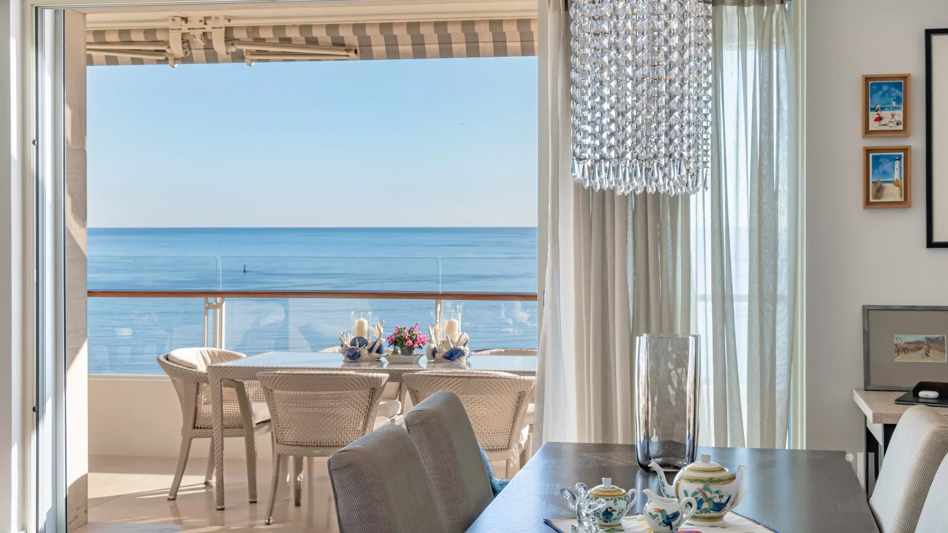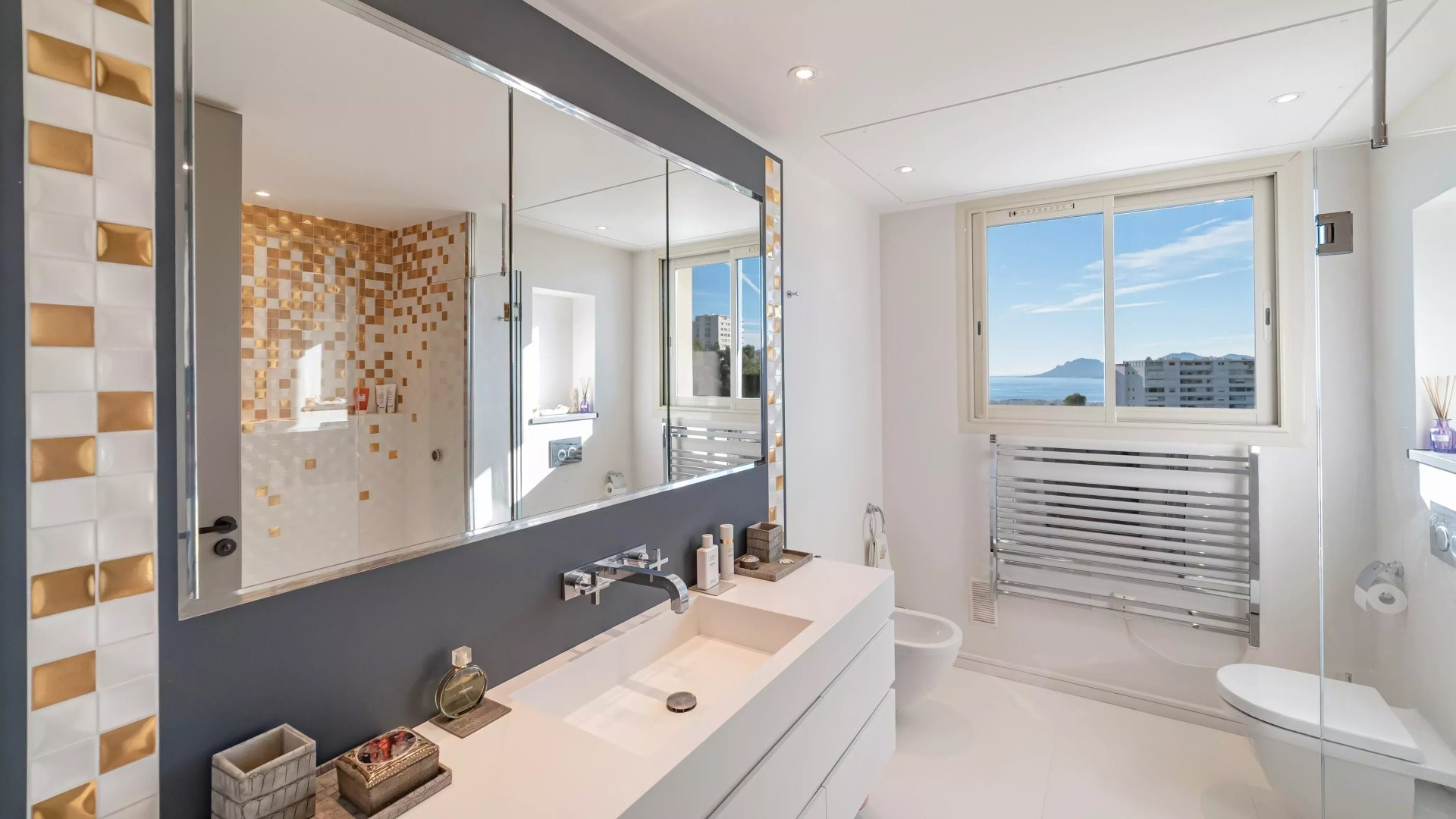 Залитая светом гостиная выходит на великолепную угловую террасу площадью около 50 м², предлагающую панорамный вид на 180 градусов, на море, острова Лерин, Эстерель и мыс Антиб.
