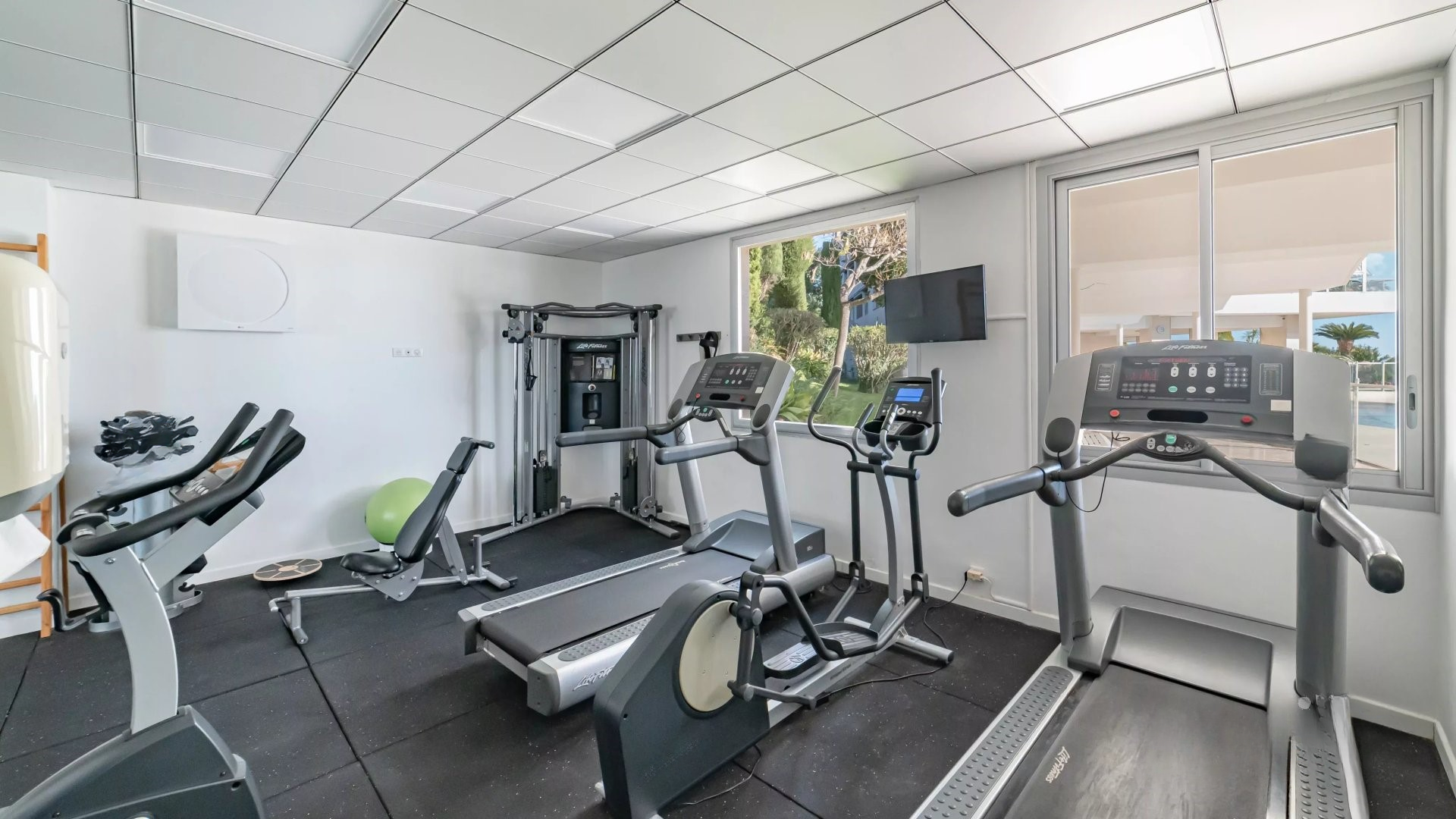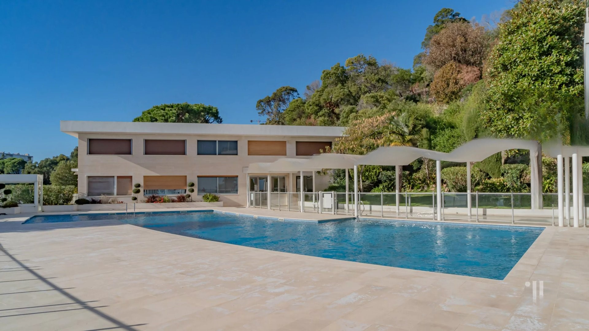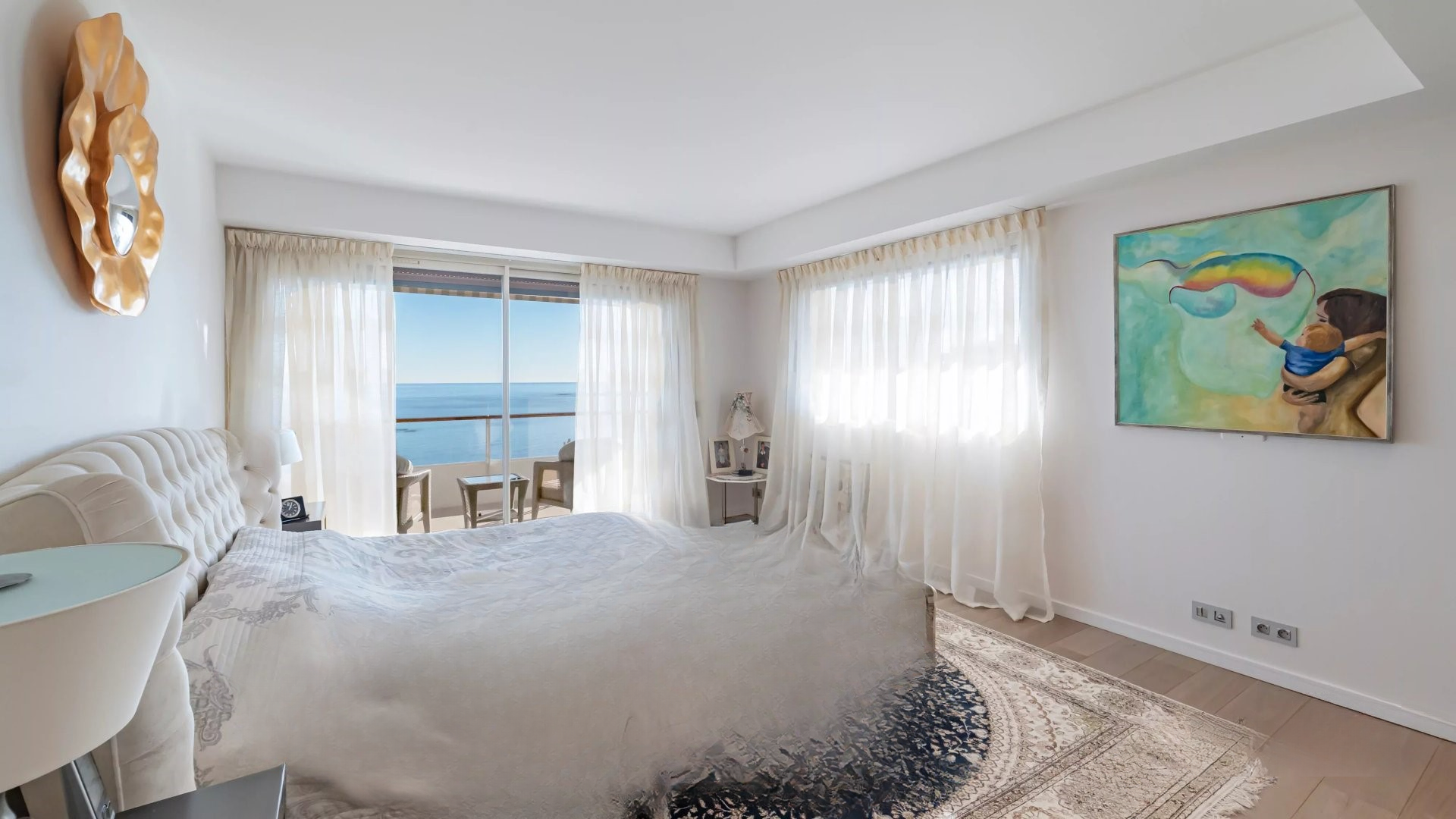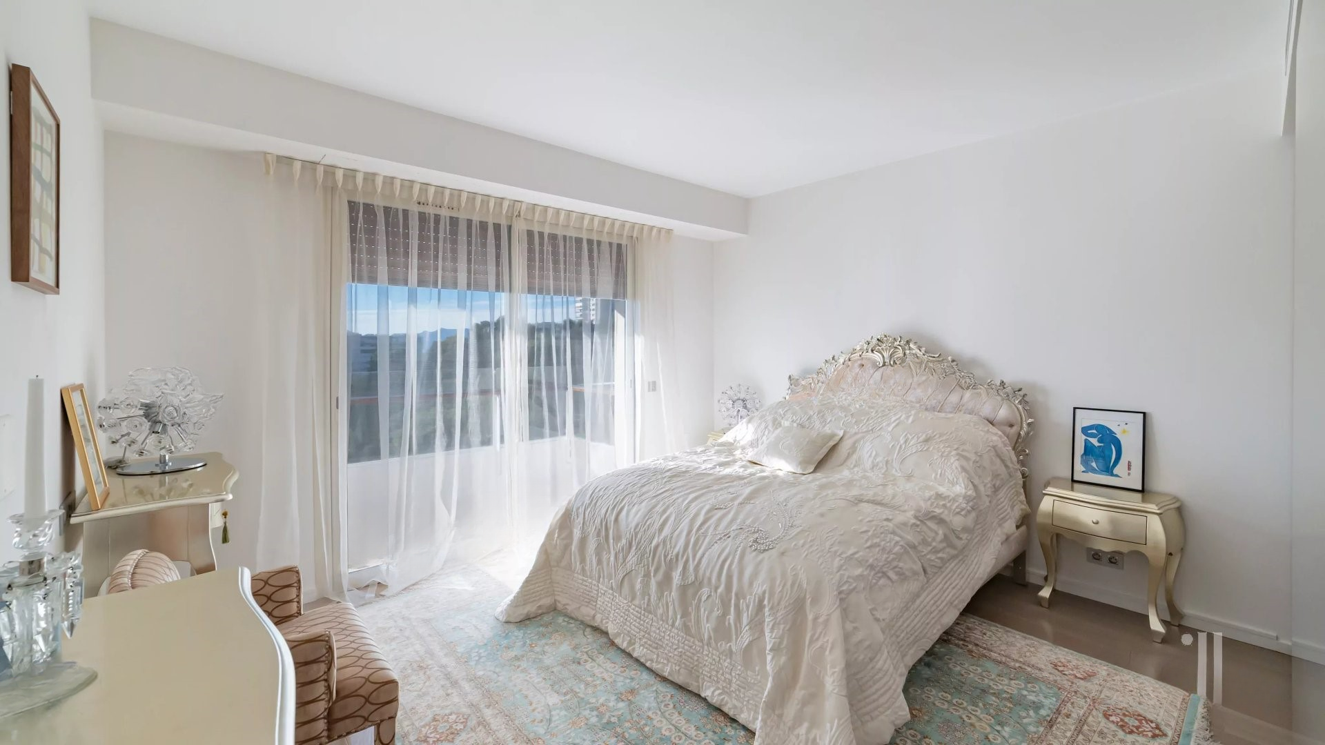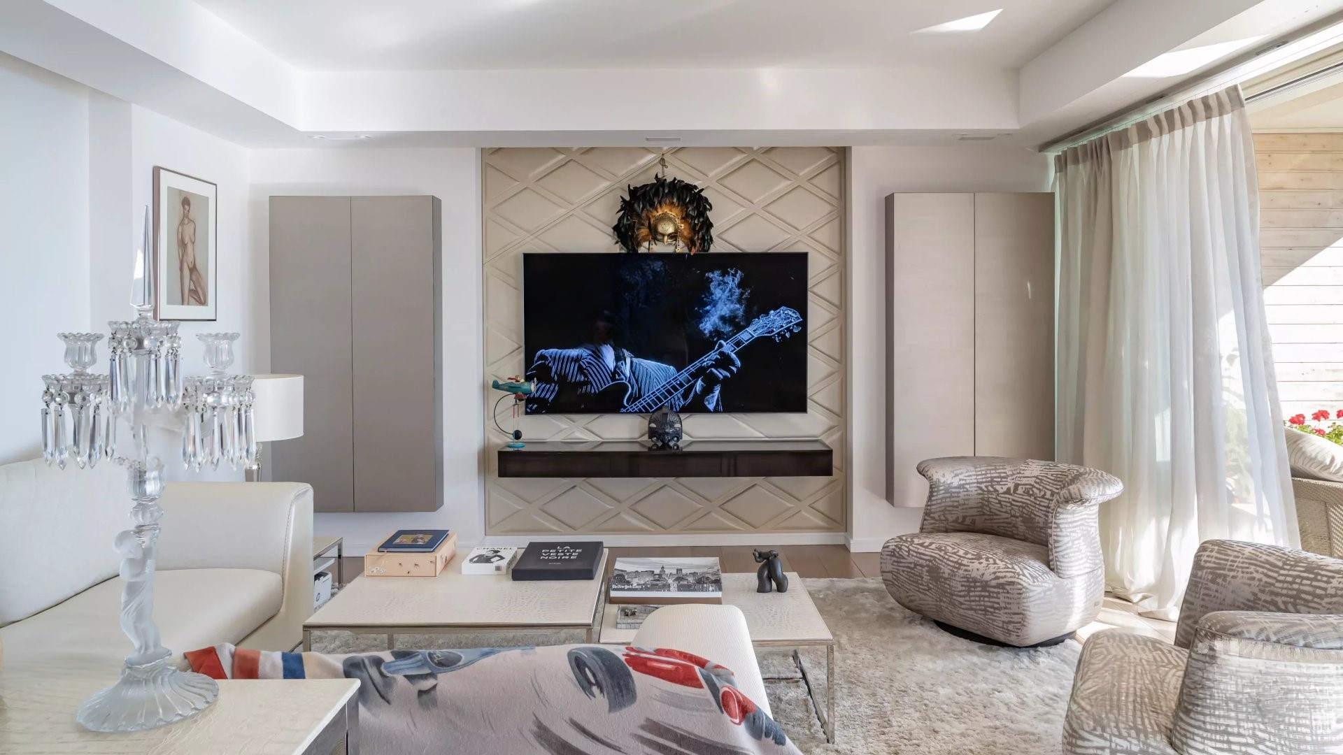 Залитая светом гостиная выходит на великолепную угловую террасу площадью около 50 м², предлагающую панорамный вид на 180 градусов, на море, острова Лерин, Эстерель и мыс Антиб.