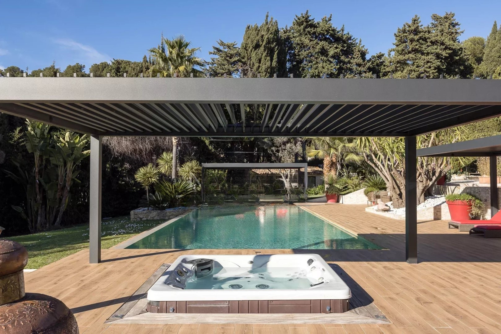 В доме 7 спален, две из которых независимые и оснащены ванными комнатами или душевыми. Красивый сад площадью около 2 485 м² полностью благоустроен, сад с бассейном, джакузи и навес для двух автомобилей. Это идеальное место для семейного проживания.