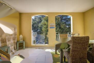 Светлую гостиную с открытой кухней, отремонтированной в 2025 году, с выходом на террасу площадью 12 м², ориентированную на юго-запад и с превосходным видом на море и сад.