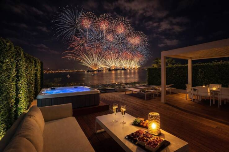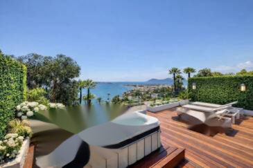 Панорамный лифт ведет на крышу, где расположена терраса из экзотического дерева с джакузи, крытой летней кухней и летней гостиной с перголой, открывая вид на залив Канн до островов Лерин и огни города. ✨