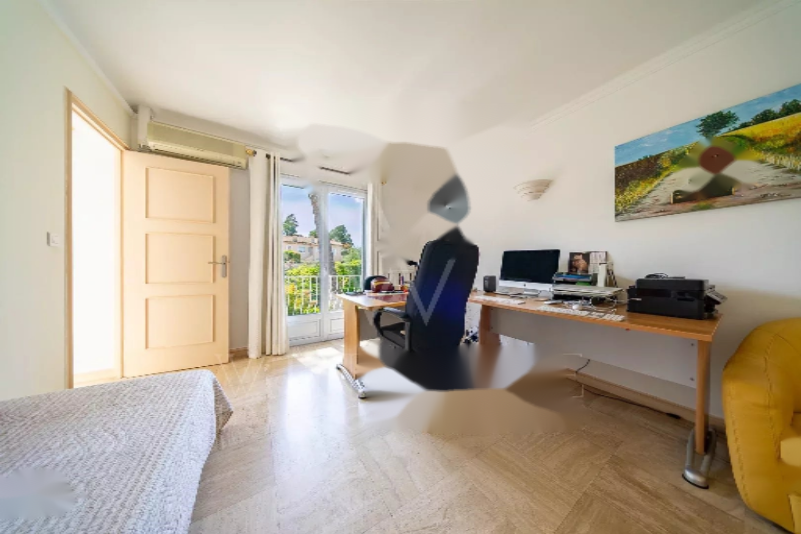 На 1-м этаже: 2 спальни, одна из которых с балконом с открытым видом (зелень), и ванная комната.