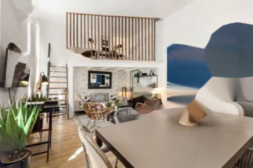 Пространство было тщательно перепланировано и оптимизировано: две антресоли, гармонично вписанные в интерьер, создают уютный рабочий уголок и спальню. ✨