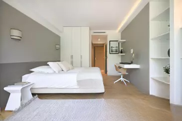 Она включает в себя просторное современное жилое пространство, в котором есть гостиная и полностью оборудованная открытая кухня. Три спальни с личными ванными комнатами для полного уединения. Великолепная терраса площадью 22 м² с потрясающим панорамным видом на море.