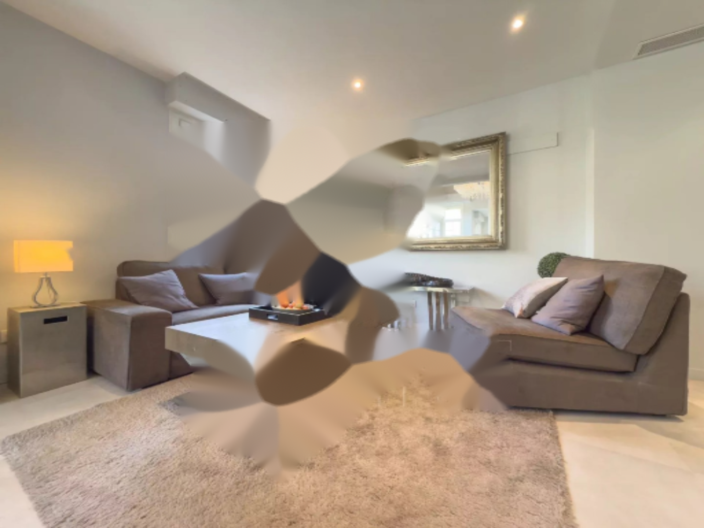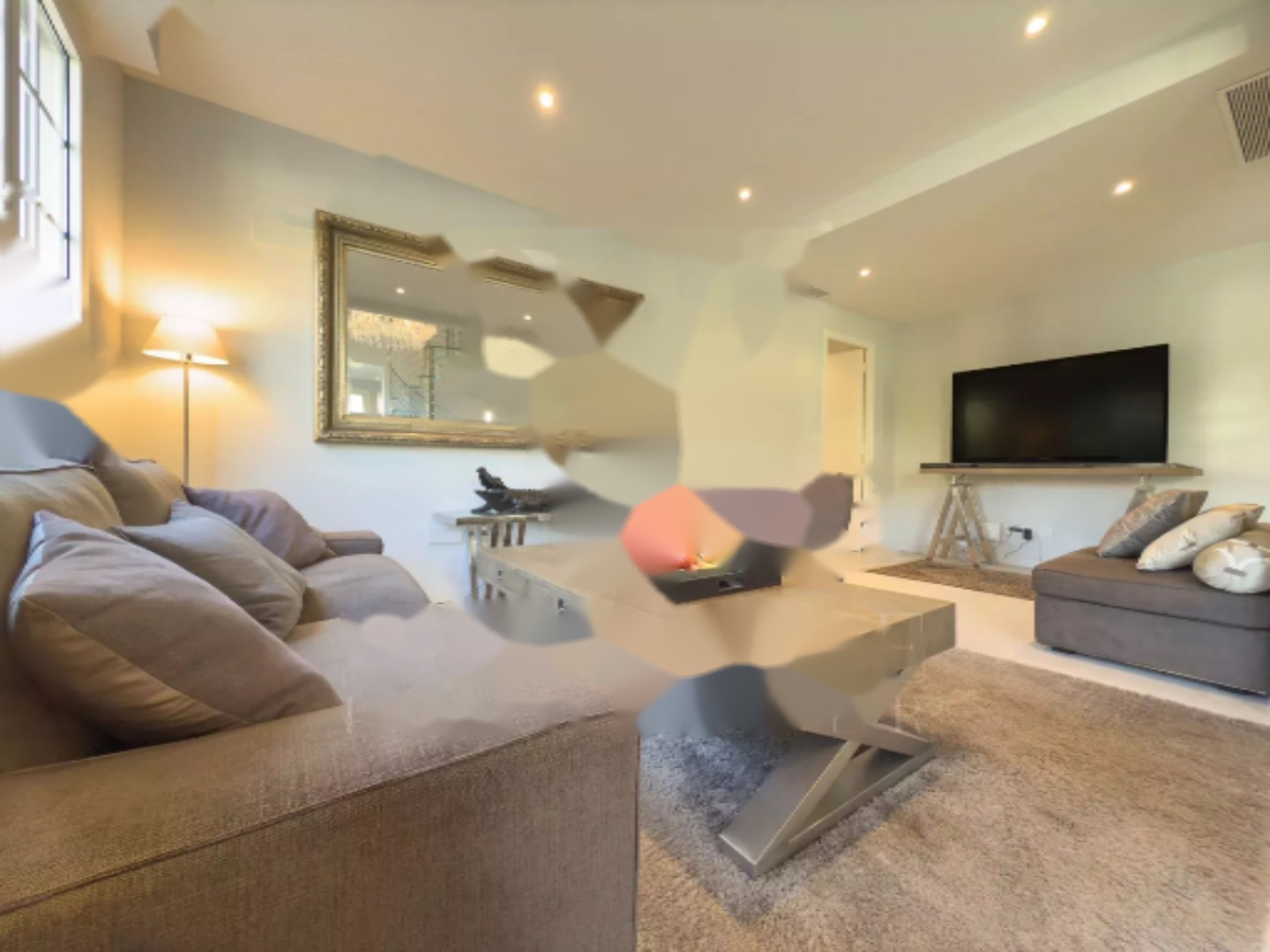 Интерьер включает в себя: один большой салон-столовую с высокими потолками, отдельную кухню, три просторные спальни, три душевые комнаты с туалетом и летнюю кухню, выходящую на большую террасу.