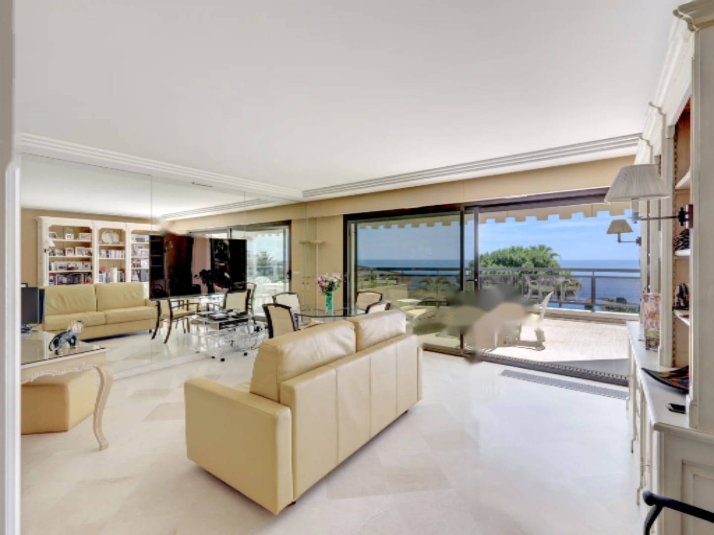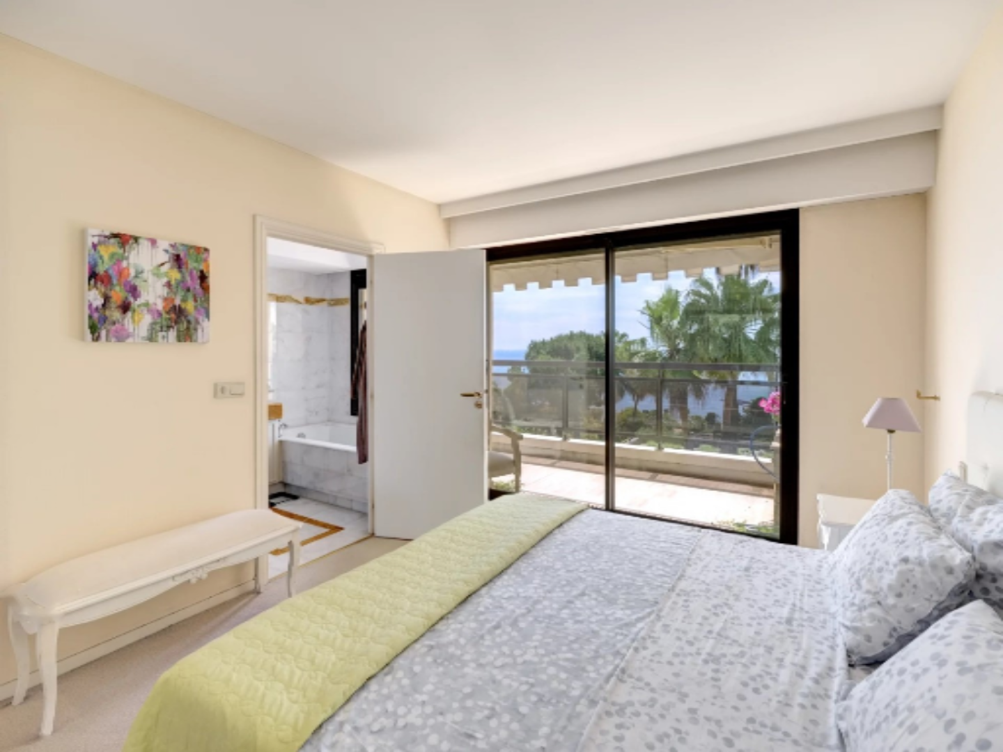 Благодаря своей южной и северной сквозной конфигурации, квартира заполнена светом. Включает в себя вход, большую гостиную площадью 38 м², очень светлую, отдельную кухню и красивую главную спальню с ванной комнатой и туалетом, все с прямым выходом на главную террасу с видом на море. Сзади расположена вторая большая спальня с ванной комнатой и второй террасой, окруженная тихой и зеленой средой, в тени мимоз. Независимый туалет для гостей.