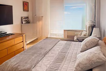 Площадь квартиры составляет примерно 95 кв. м, включающая гостиную с выходом на красивую террасу, главную спальню с видом на море, гардеробной и ванной комнатой с туалетом, вторую спальню с душевой комнатой, отдельный гостевой туалет, оборудованную кухню и лоджию на северной стороне.