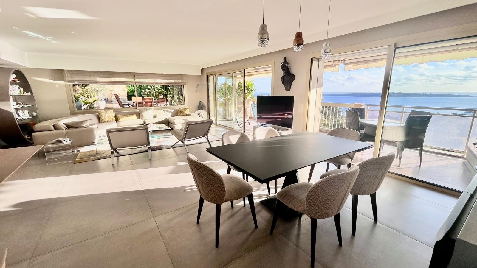 Апартамент состоит из светлой и просторной гостиной, элегантной американской кухни с обеденной зоной, продолженных большой террасой с панорамным видом на острова Лерин и залив Канн.