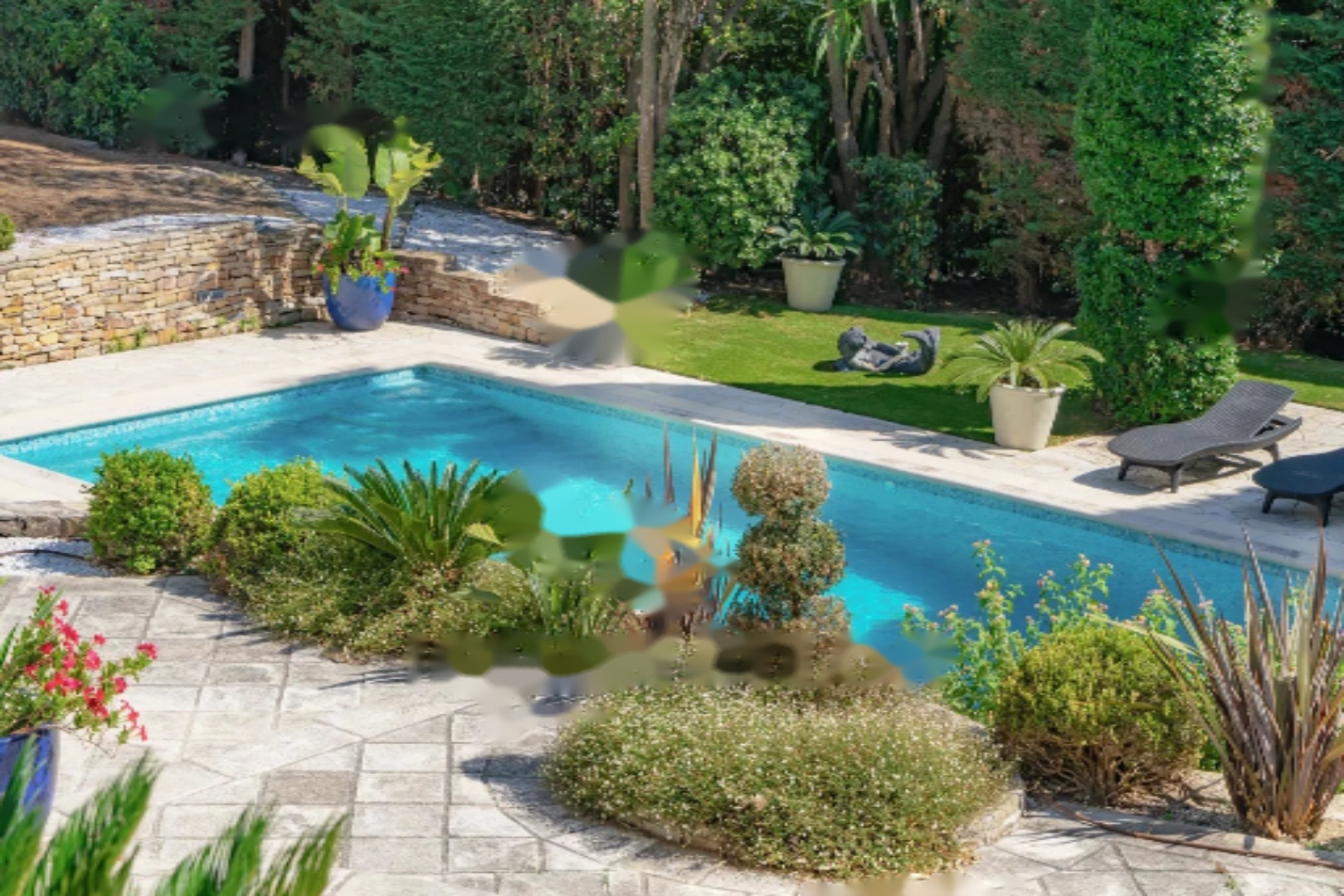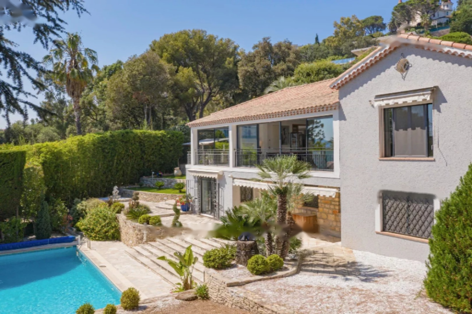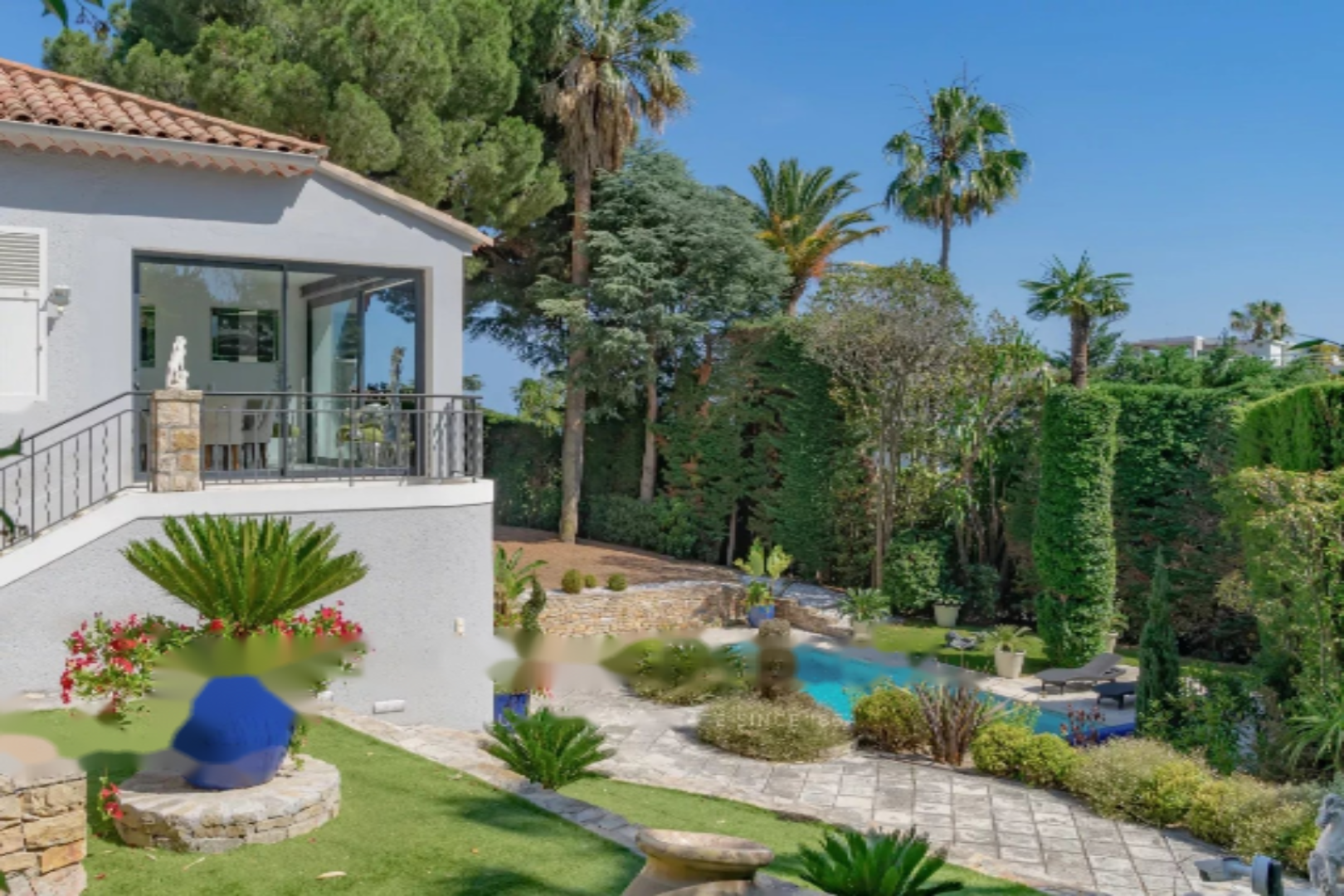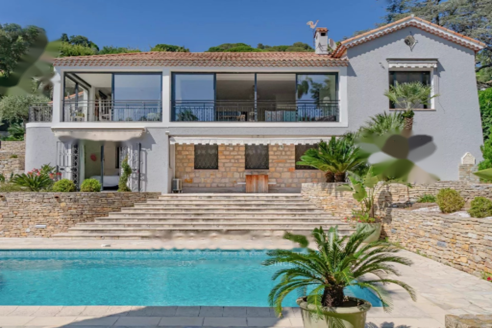 Обладая большими объемами, она имеет общую площадь 400 м², разделенную на два уровня. Она ориентирована на юг и оснащена многочисленными солнечными террасами, окружена очаровательным ландшафтным садом с большим бассейном длиной 12 метров и несколькими видами на море.