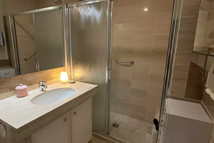 Зона отдыха: две комфортные спальни и элегантная ванная комната в травертине.