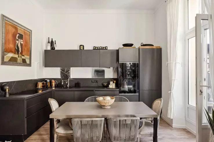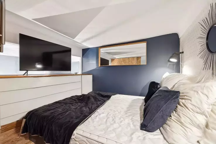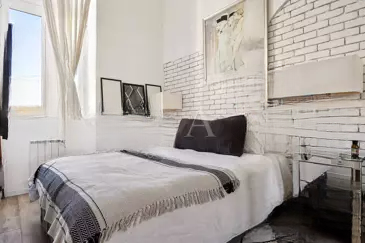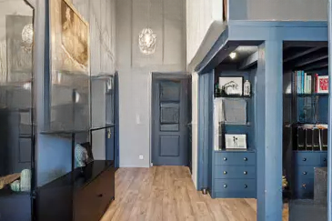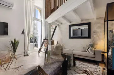 Благодаря исключительной высоте потолков 4,70 м, эта квартира, ориентированная на юг, прекрасно освещена в течение всего дня. Состоит из прихожей, открытой кухни, примыкающей к светлой гостиной, спальни, ванной комнаты с душем и туалетом, а также двух мезонинов, обустроенных под жилые и рабочие зоны.