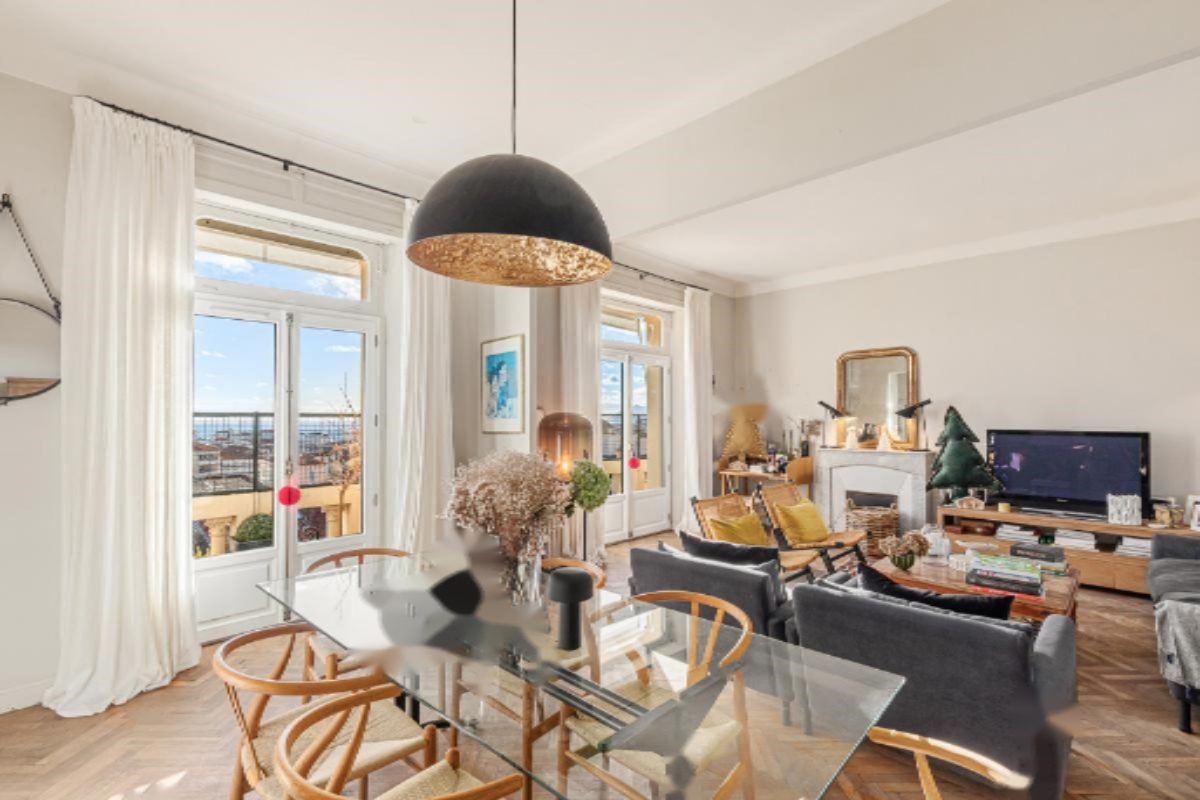 Квартира расположена на 4-м и последнем этаже без лифта (но есть возможность установки частного лифта). Открыв большую дверь квартиры, вы попадете в холл с высокими потолками, который слева ведет к красивой и светлой гостиной с каминами. Паркет из классического рисунка дощатого пола ведет к большим двустворчатым окнами и балконам, откуда открывается великолепный вид на море и острова Лерин до Теуля на море.