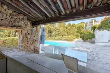 Ландшафтный сад площадью 1 720 кв. м, обращенный на юго-запад и прекрасно ухоженный, радует бассейном с большим солнечным пространством вокруг, оборудованным домиком у бассейна для летних обедов и затененные зоны для отдыха. Все это окружает великолепный природный пейзаж, открывающий захватывающий вид на окружающие холмы.