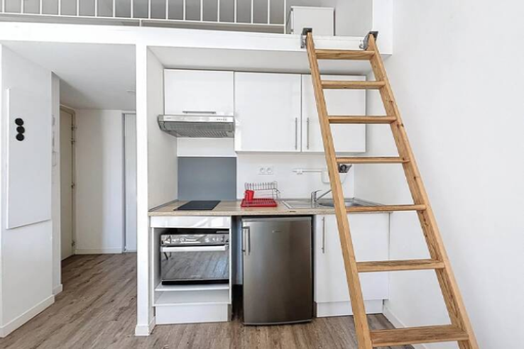 Студия площадью 21 м² с мезонином в красивом полностью обновлённом здании находится недалеко от центра города. Она включает в себя жилое пространство с открытой кухней, мезонин, шкафы и душевую с отдельным туалетом.