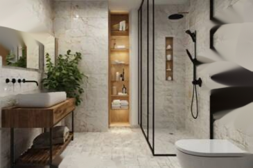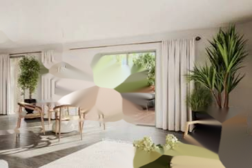 Он состоит из: гостиной с открытой кухней, 3 спален, душевой и ванной, отдельного туалета и внешнего пространства площадью 120 кв. м.