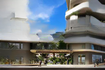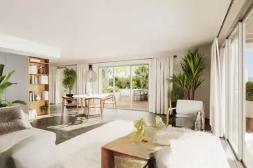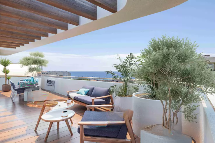 Гостиная с кухней площадью 51 м² выходит на террасу площадью 122 м². Из 4-х спален с выходом на террасу одна является главной спальней с душевой, туалетом и гардеробной. В квартире также имеются ванная и отдельный туалет.