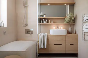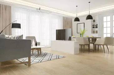Объект включает в себя прихожую, которая ведет к просторной гостиной-кухне площадью 45 м² с выходом на обеденную террасу.