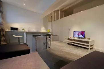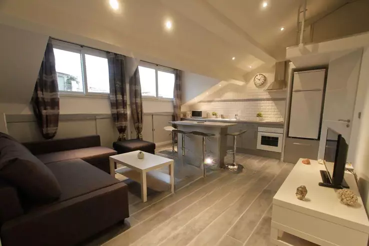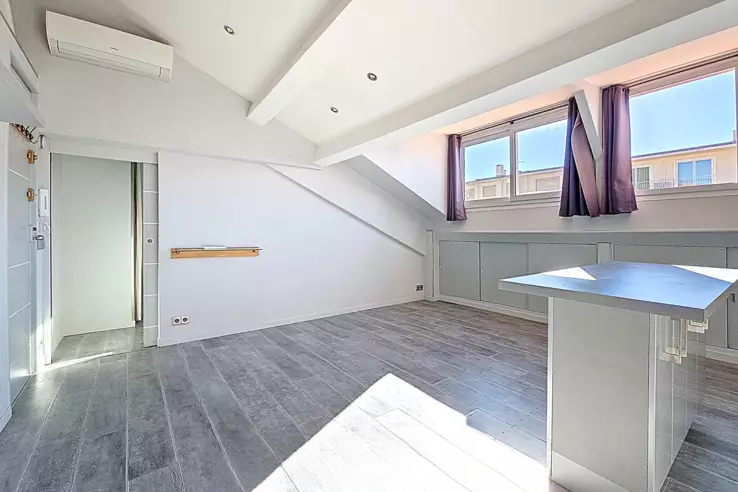 Расположен в 50 метрах от пляжей и в 100 метрах от Старого порта на последнем этаже (без лифта), 2-комнатная квартира недавно полностью отремонтирована и включает гостиную с оборудованной и меблированной кухней в американском стиле, спальню с шкафами и ванную комнату с туалетом.