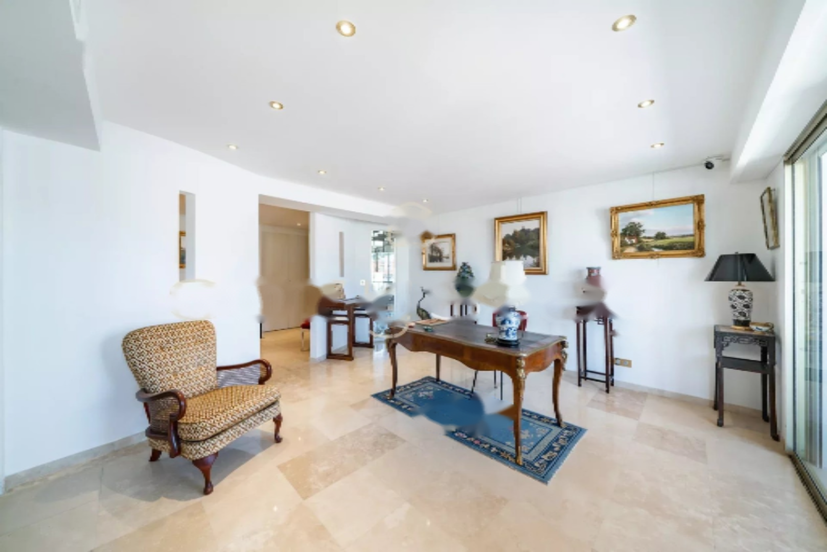 Квартира включает в себя холл, гостиную, отдельную кухню, основную спальню площадью 21 м², четыре дополнительных спальни, две ванные комнаты и четыре душевые комнаты.