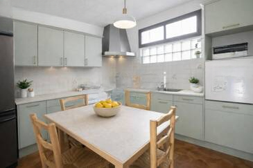 Этот просторный пятиквартирный апартамент состоит из светлой гостиной, выходящей на террасу, которая идеально подходит для обедов на свежем воздухе и летних вечеров с видом на море, отдельной кухни, четырех спален, душевой, отдельного туалета и кладовки. ️ Большое количество мест для хранения дополняет комфорт этой недвижимости.
