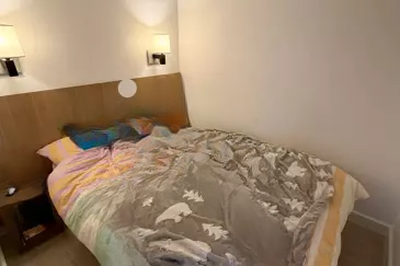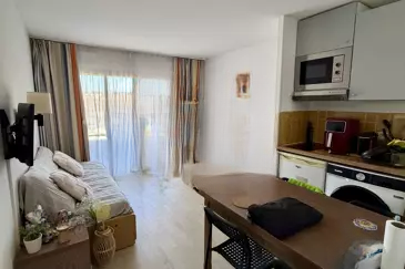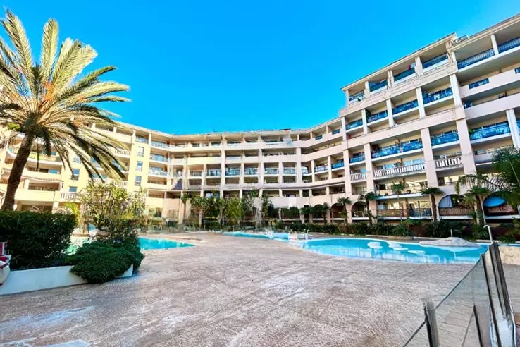 В резиденции с охраной и бассейном в Cannes la Bocca, в шаговой доступности от пляжей и университетского центра, предлагается светлая двухкомнатная квартира площадью около 27 кв.м с северной экспозицией, включающая открытую кухню, спальню, ванную комнату с туалетом и балкон.