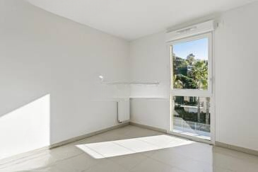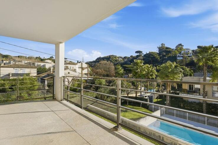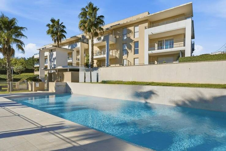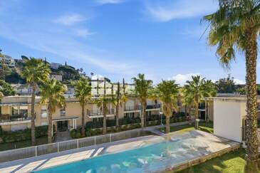 Гостиная с открытой кухней выходит на большую витражную дверь и красивую террасу площадью 13 м², с видом на бассейн, как и спальня. Дополнительно к квартире идет закрытый бокс площадью 13,50 м².