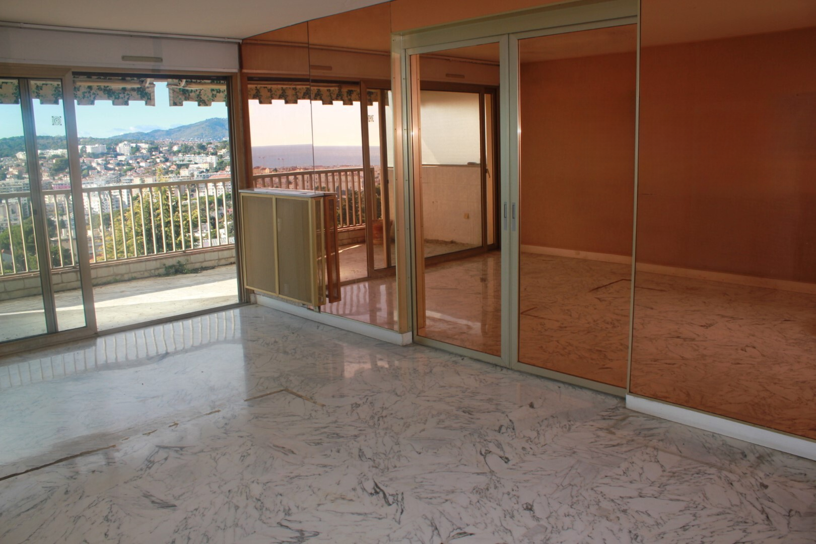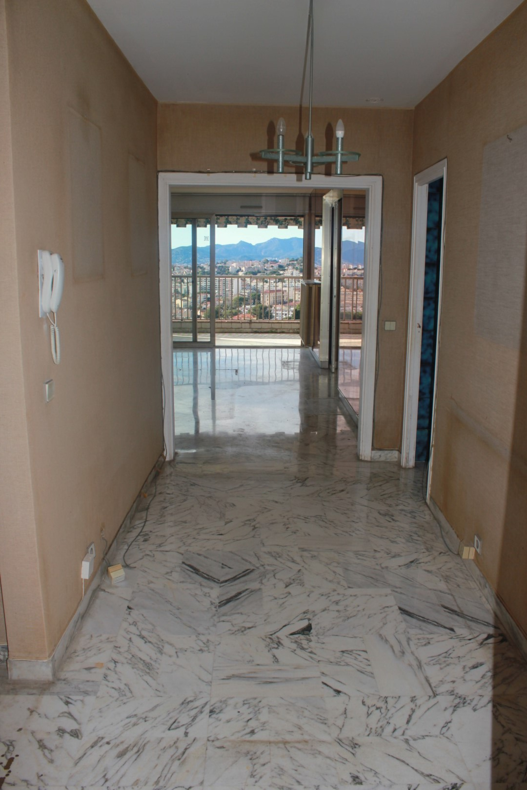 Площадь квартиры около 105 кв.м. Она включает входную зону, ведущую в просторную гостиную с большой террасой, ориентированной на юг, с оптимальным освещением и уникальным видом на море и Эстерель.