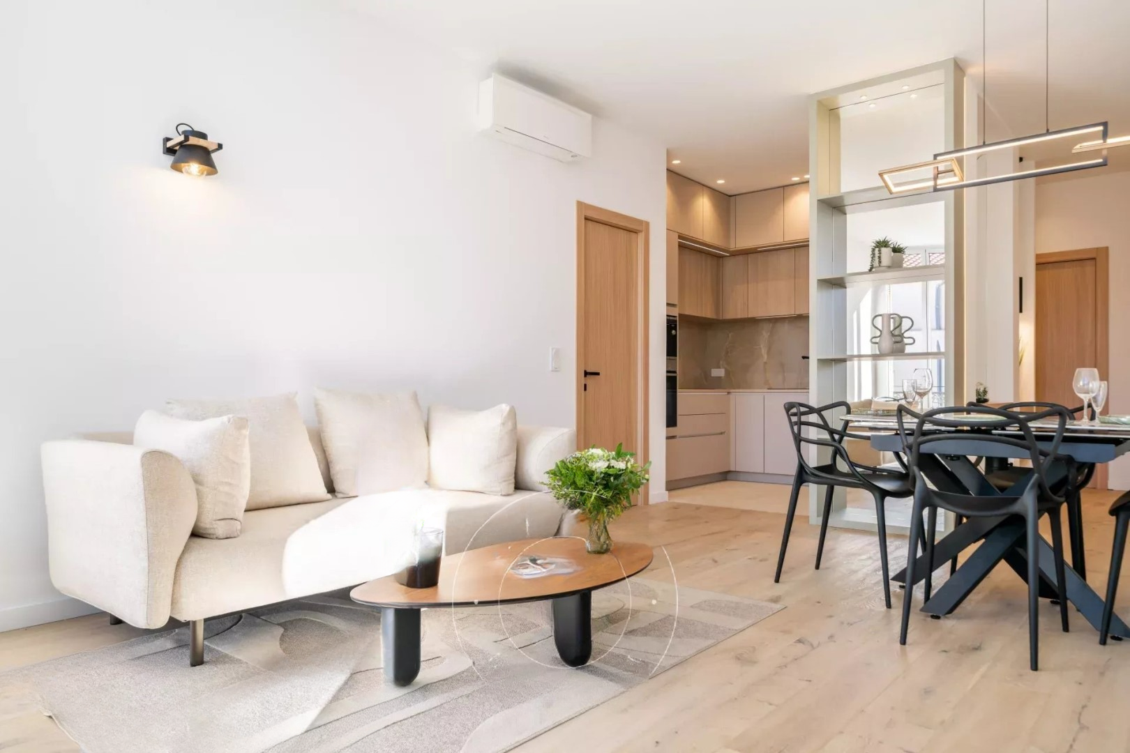 Она состоит из входной зоны, светлой гостиной с южной ориентацией, которая открывается на балкон, с открытой кухней.