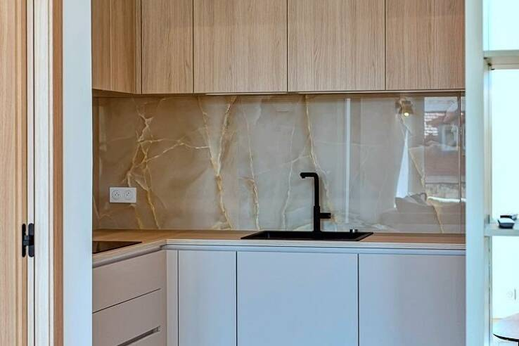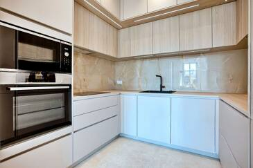 Изысканная и светлая гостиная выходит на приятный балкон с южной ориентацией. Открытая кухня, полностью обустроенная и оснащенная, гармонично вписывается в зону приема гостей.