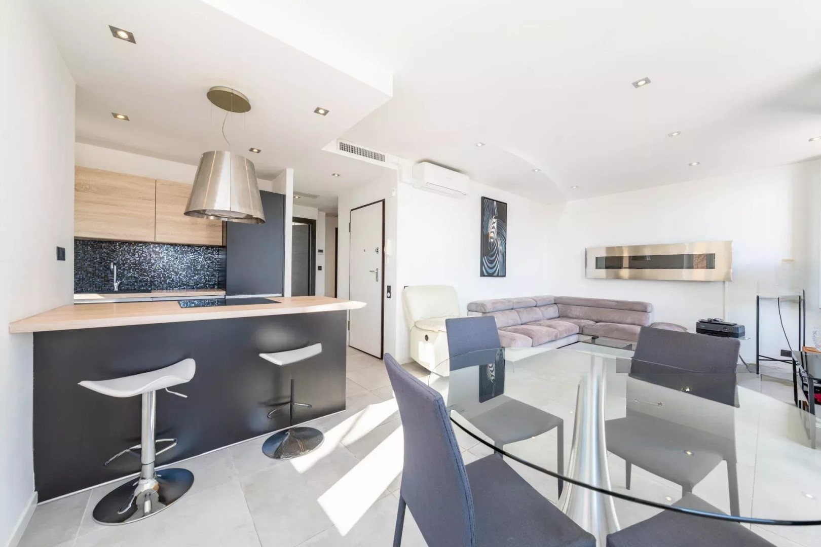 Светлая гостиная с полностью оборудованной открытой кухней.
