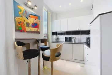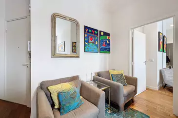 Расположенный в резиденции в буржуазном стиле, апартамент выделяется высоким потолком и большими окнами, подчеркивающими ощущение простора и света. Каждый квадратный метр оптимизирован для избежания потерь пространства: в нем есть вход, гостиная с открытой и оборудованной кухней, спальня с встроенным шкафом, ванная комната и отдельный туалет.
