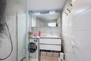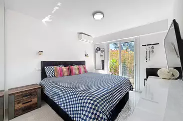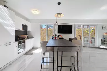 Квартира включает вход с переходом в обширную светлую гостиную площадью 30 м² с полностью оборудованной и обставленной американской кухней, уютную спальню с гардеробной, современную ванную комнату и отдельные туалеты.