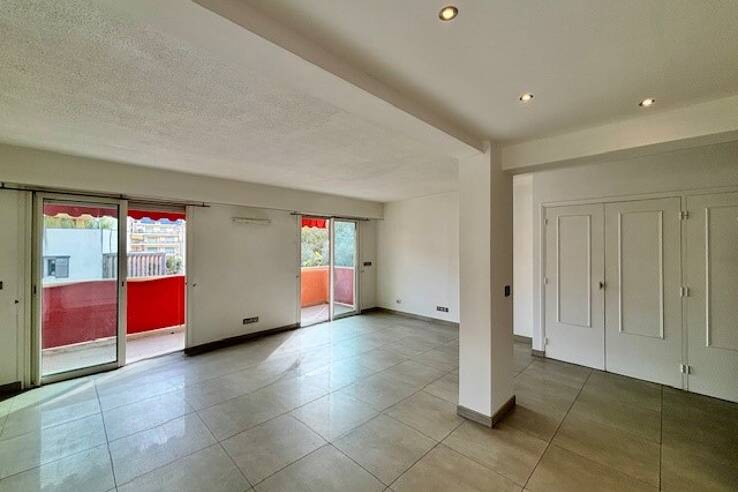Предлагается двухкомнатная квартира в районе Английского квартала в Каннах. Жилплощадь составляет 57 м² по закону Каррез, включая входную зону с шкафами, гостиную с американской кухней площадью 34 м², восточную террасу и комнату с балконом. Ванная комната с окном и отдельный туалет дополняют пространство. В квартире есть подвал и парковка в подвале.