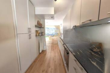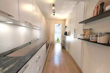 Этот рядный дом, прилегающий с одной стороны, на первом этаже включает в себя: вход с кладовкой, отдельный туалет, прачечную, светлую гостиную площадью 24.84 м² и кухню площадью 6.68 м². Все помещения выходят на приятную внешнюю зону площадью 54.08 м², в которую входят терраса/сад размером 43.77 м² и внутренний дворик у входа размером 10.31 м².