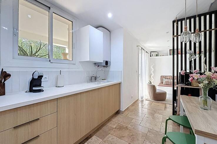 Восемь минут пешком до центра Канн, в районе bas Petit-Juas, в небольшом тихом кондоминиуме. Откройте для себя эту прекрасную двухкомнатную квартиру, полностью отремонтированную, расположенную на первом этаже с садом. Общая площадь 34,03 м², ориентация на юг и запад.