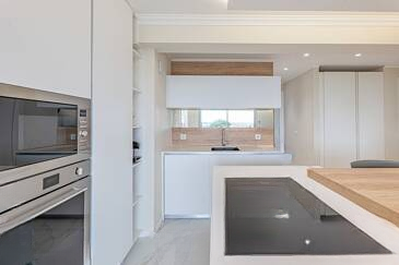 С порога задается ощущение: палитра от чистого белого до льняных оттенков создает органичную и уютную атмосферу. Гостиная, настоящее сердце дома, оснащена открытой кухней с минималистичными линиями, которые элегантно совмещены с зоной отдыха. Пространство открывается на террасу, выходящую на юг, где можно наслаждаться видом на море и солнечными вечеринками.