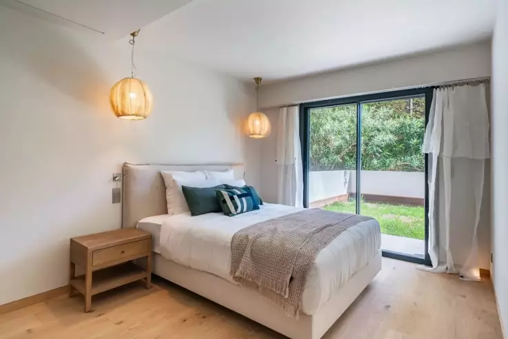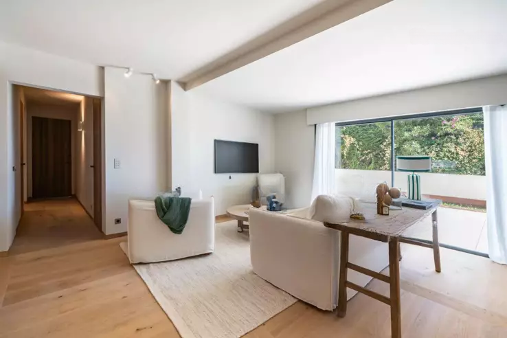 Добро пожаловать в эксклюзивную возможность – эта квартира на цокольном этаже с собственным входом расположена в престижном районе Palm Beach. Просторная и светлая, с площадью по Loi Carrez 125,06 кв. м, она включает большую комнату для гостей с оборудованной кухней, две спальни с собственными ванными комнатами и главную спальню с ванной и гардеробной, а также гостевой туалет.