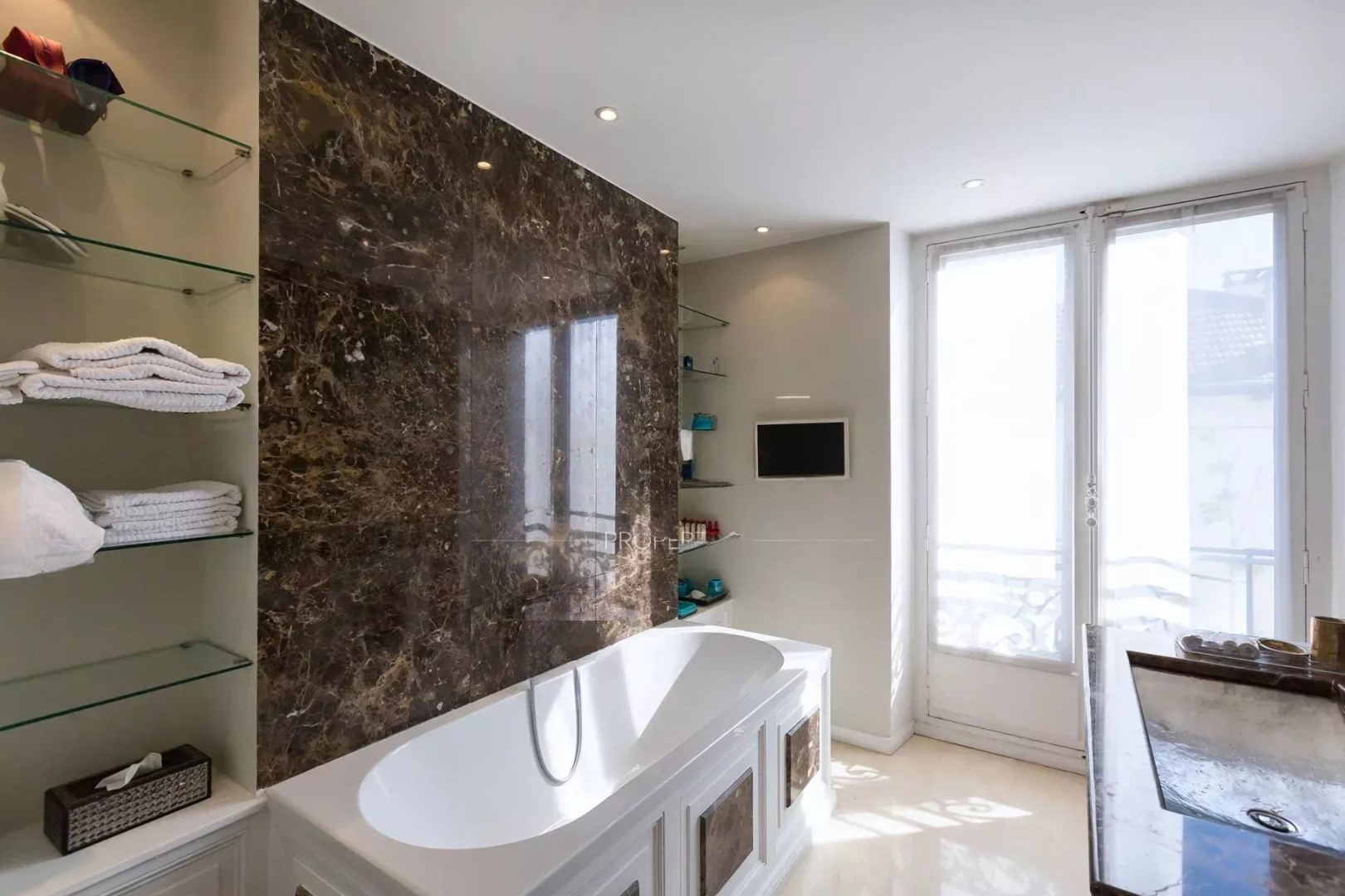 Стиль квартиры — буржуазный, в хорошем состоянии, с красивыми объемами и всем шармом старинной архитектуры в спокойной обстановке, в непосредственной близости ко всем удобствам. В здании предусмотрены: кондиционер, двойное остекление, электрические ворота, и охрана.
