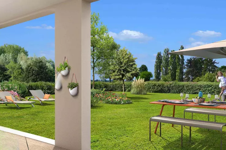 Квартира располагает большим личным садом, террасой с выгодным расположением для солнца и светлыми интерьерами с высококачественной отделкой: обратимая канализированная климатизация, керамическая плитка 60x60, кафель до потолка в ванных комнатах, подвесные унитазы, термодинамический водонагреватель.