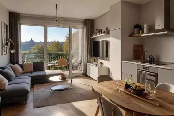 Прекрасные 3 комнаты площадью 60 кв. м, включающие гостиную с кухней в 30 кв. м, продолжающуюся балконом в 12 кв. м. Две спальни в престижной резиденции.