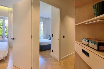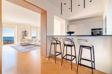 Апартамент включает в себя входную зону, светлую гостиную с открытой полностью оборудованной кухней, родительскую спальню с ванной комнатой и гардеробной, две спальни, душевую комнату с туалетом и гостевой санузел.