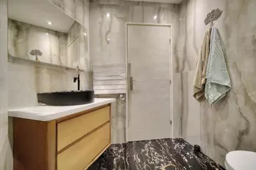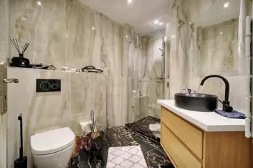 Полностью недавно отремонтирована с использованием качественных материалов, она включает в себя прихожую, светлую гостиную с кухней в американском стиле, большую спальню, вторую спальню, а также просторную мраморную ванную комнату.