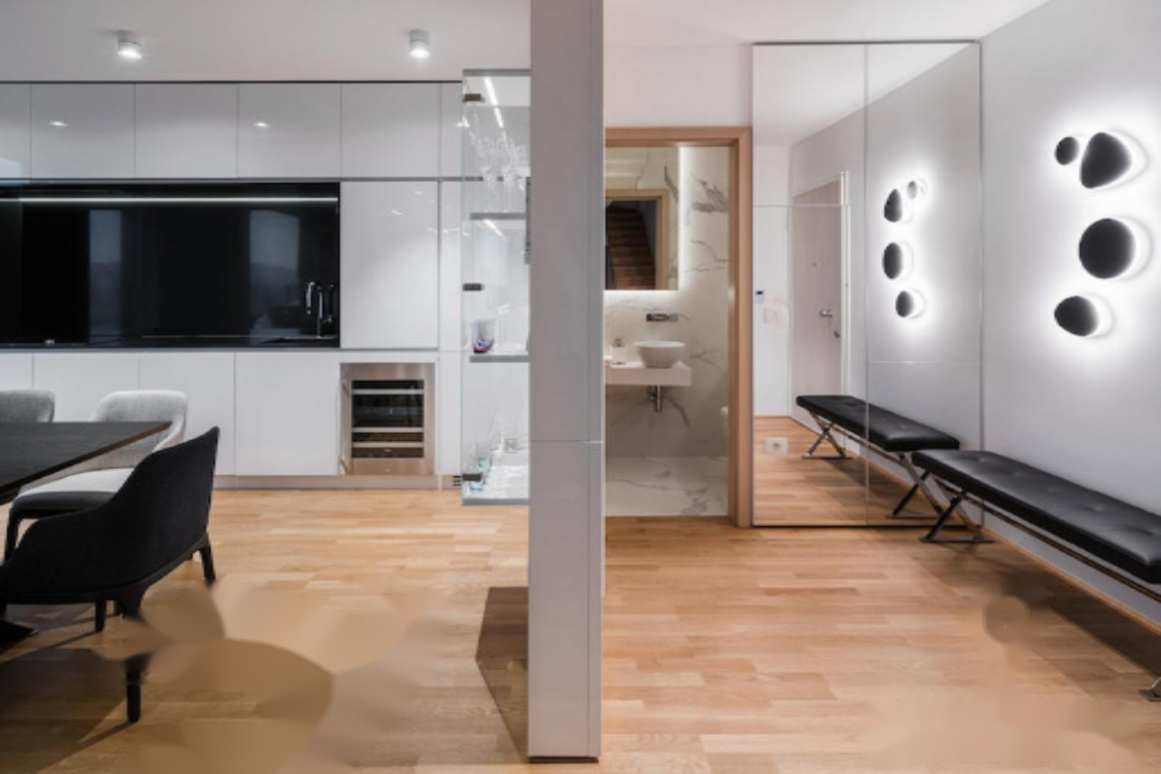 Пентхаус впечатляет своим дизайном и планировкой. На первом уровне расположены просторная гостиная, объединённая с кухней и обеденной зоной, хозяйственное помещение, терраса и санузел. На верхнем уровне находится главная спальня с собственной ванной комнатой, а также две детские спальни и ещё одна ванная комната.